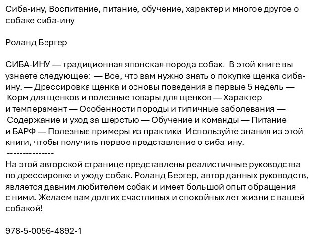 Сиба-ину. Воспитание, питание, обучение, характер и многое другое о собаке cиба-инуВ данный момент этот товар отсутствует в продаже. Возможно, у нас найдется аналогичный или похожий товар здесь. Книги по воспитанию домашних животных помогают владельцам понять поведение своих питомцев, обучить их полезным командам и создать комфортные условия для жизни. Эти книги подходят как для начинающих, так и для опытных владельцев, желающих лучше понять своих животных и сделать их жизнь счастливее. В книге рассматриваются основные принципы дрессировки, психологические особенности различных видов животных, советы по уходу, а также методы коррекции нежелательного поведения. Автор: Бергер Р. |