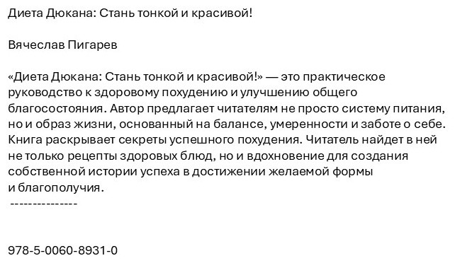 Диета Дюкана. Стань тонкой и красивой!В данный момент этот товар отсутствует в продаже. Возможно, у нас найдется аналогичный или похожий товар здесь. «Диета Дюкана: Стань тонкой и красивой!» — это практическое руководство к здоровому похудению и улучшению общего благосостояния. Автор предлагает читателям не просто систему питания, но и образ жизни, основанный на балансе, умеренности и заботе о себе. Книга раскрывает секреты успешного похудения. Читатель найдет в ней не только рецепты здоровых блюд, но и вдохновение для создания собственной истории успеха в достижении желаемой формы и благополучия. Автор: Пигарев В. |