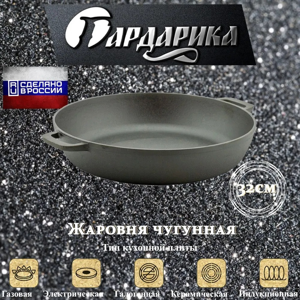 Жаровня хорошего качества, но мне попался с небольшим дефектом, отколот малюсенький чугун, надеюсь не принесет вреда для здоровья , в верхней части сковороды