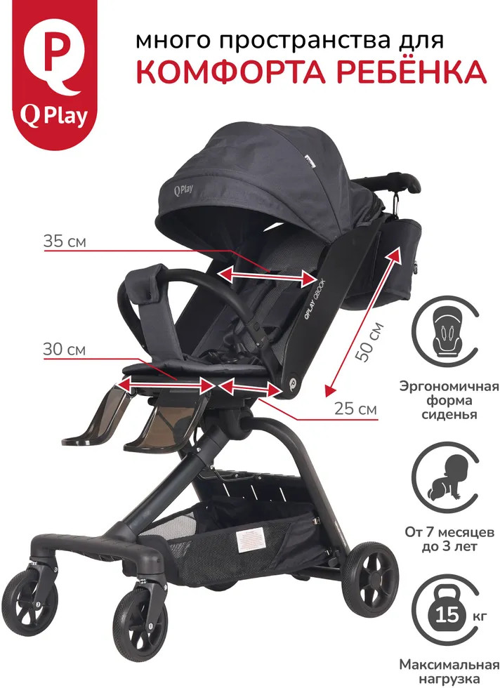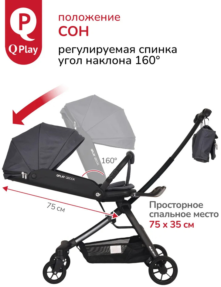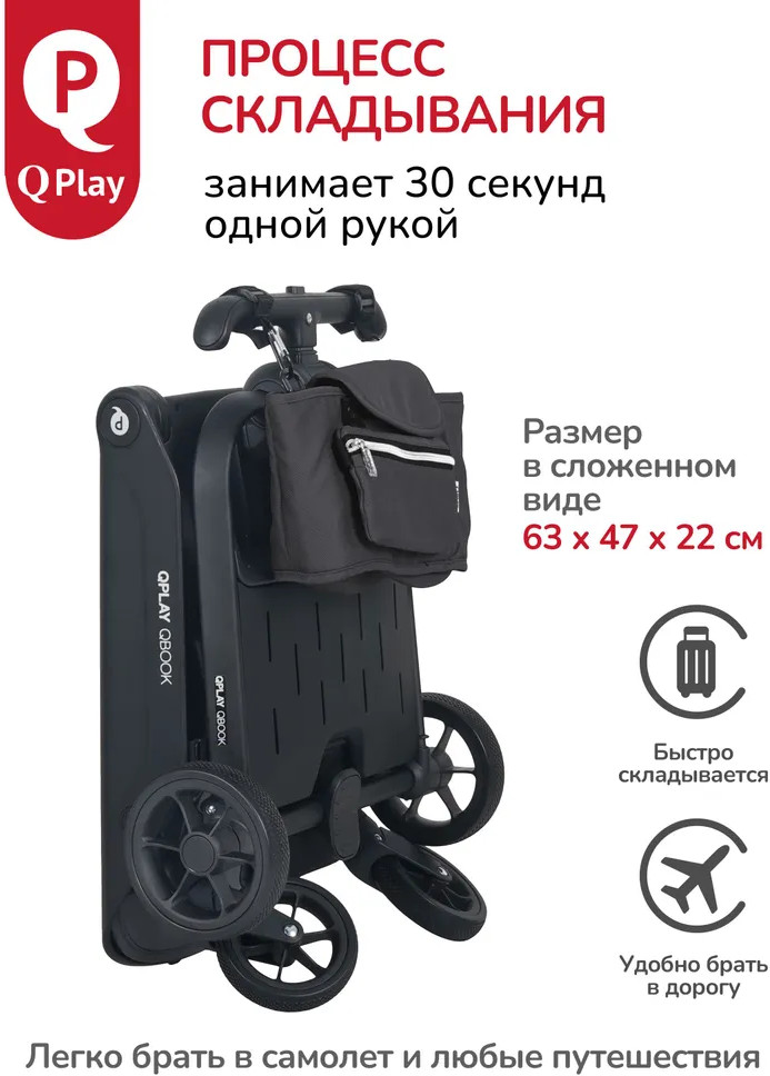 Детская складная коляска премиум-класса «Qbook» 360° от всемирно известной немецкой ТМ Qplay сочетает современный дизайн, многофункциональность и повышенный комфорт во время использования. Коляска произведена по стандартам EN1888-1 из современных материалов, что гарантирует высокую надёжность и полную безопасность для ребёнка. Благодаря поворотному сиденью, малыш может совершать прогулку не только глядя вперёд, но и лицом к родителю. Многопозиционная откидывающаяся спинка обеспечивает детям максимальный комфорт. Диапазон регулировки спинки 50° до положения «сон» (угол наклона 160°). Коляска «Qbook» с компактной складной рамой после складывания превращается в чемодан, что очень удобно для хранения и транспортировки. Ее можно поместить в багажник и отправиться с ребёнком в торговый центр и на прогулку или взять с собой в самолёт. Размер в сложенном виде всего 63×47×22 см.