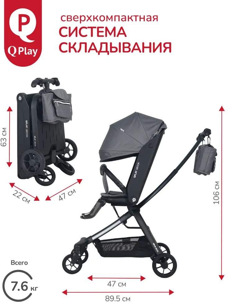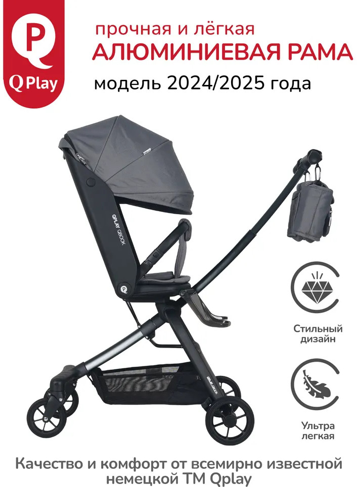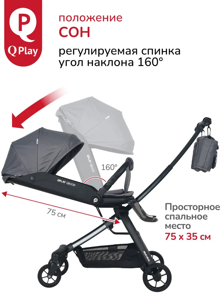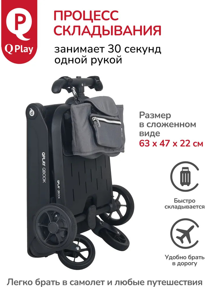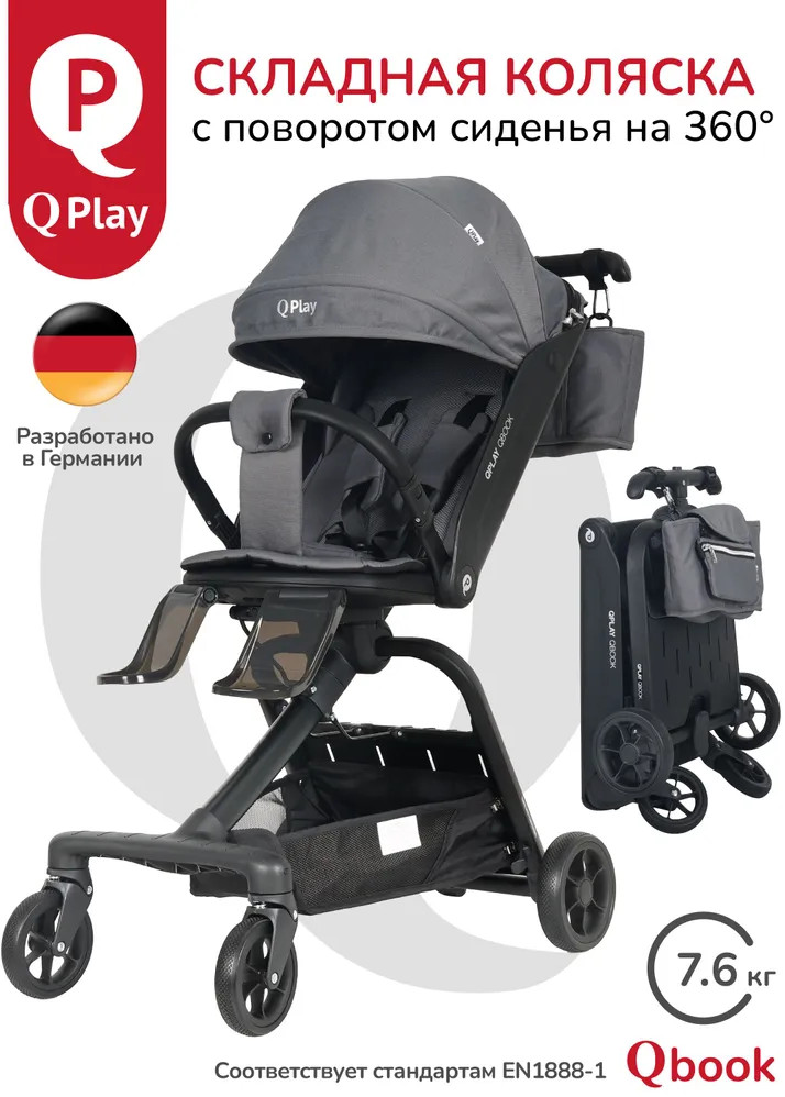 Детская складная коляска премиум-класса «Qbook» 360° от всемирно известной немецкой ТМ Qplay сочетает современный дизайн, многофункциональность и повышенный комфорт во время использования. Коляска произведена по стандартам EN1888-1 из современных материалов, что гарантирует высокую надёжность и полную безопасность для ребёнка. Благодаря поворотному сиденью, малыш может совершать прогулку не только глядя вперёд, но и лицом к родителю. Многопозиционная откидывающаяся спинка обеспечивает детям максимальный комфорт. Диапазон регулировки спинки 50° до положения «сон» (угол наклона 160°). Коляска «Qbook» с компактной складной рамой после складывания превращается в чемодан, что очень удобно для хранения и транспортировки. Ее можно поместить в багажник и отправиться с ребёнком в торговый центр и на прогулку или взять с собой в самолёт. Размер в сложенном виде всего 63×47×22 см.
