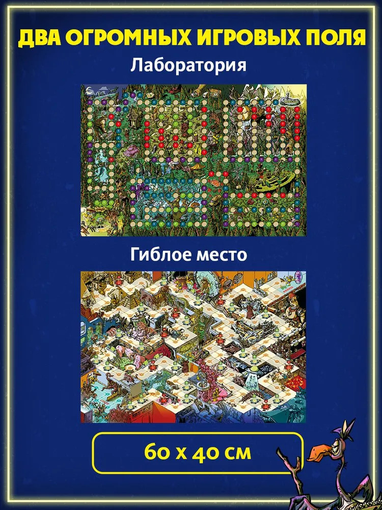 Две разных игры-бродилки в одной коробке определят эту цену для вас. Итак, «Лаборатория» и «Гиблое место» — для тех, кто готов проверить дружбу на прочность. Испытания ждут немалые — игроки бегут к финишу и в свои ходы устраивают весёлую жизнь фишкам соперников. Тут всё зависит от вас — то ли столкнуть ближнего в нехороший портал, то ли развернуть на плохую дорожку, то ли протянуть руку помощи, то ли открыть для него не ту дверь. Правила предельно просты, а девиз — коварство и беспринципность, помноженные на недетское веселье от происходящего.
