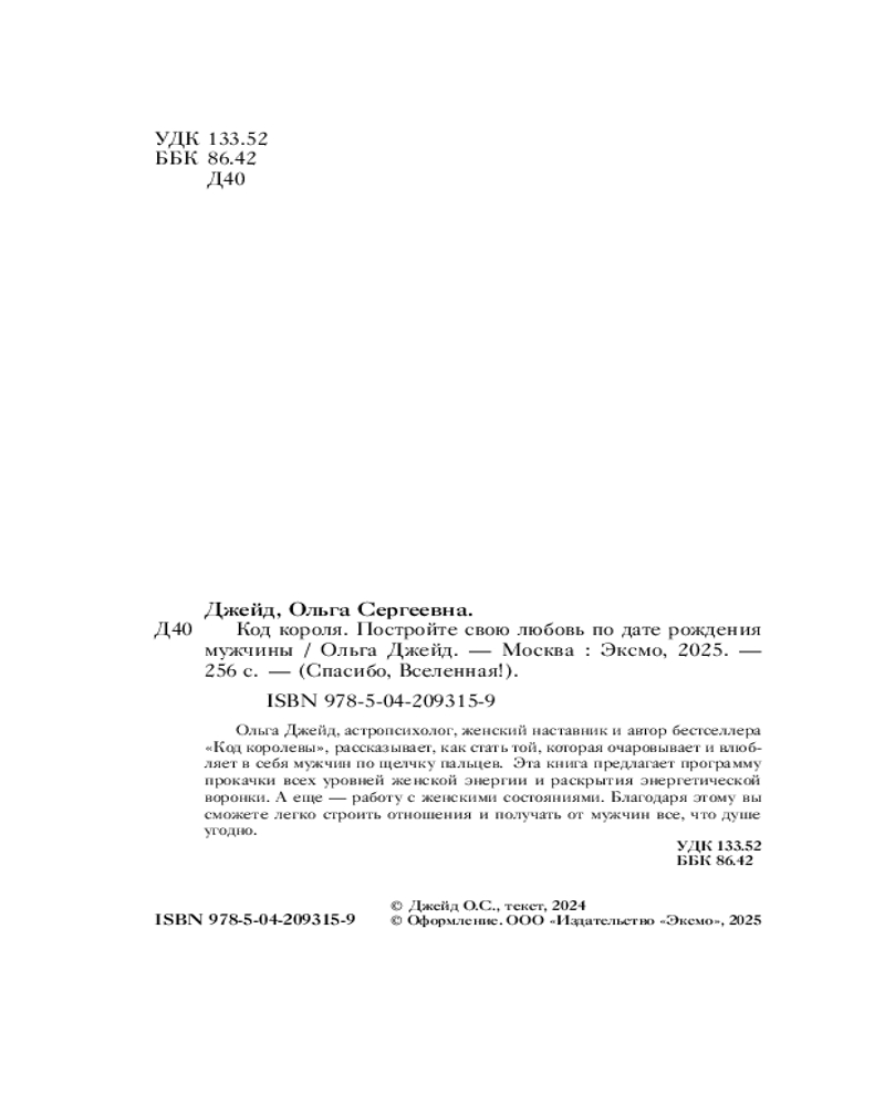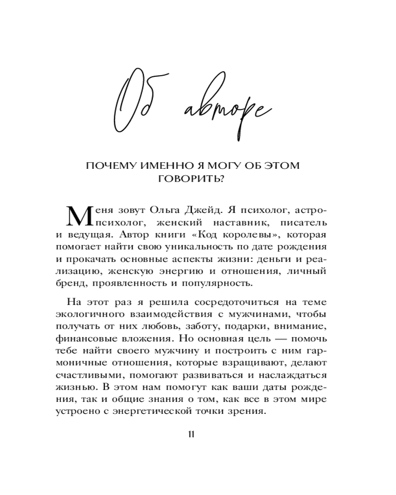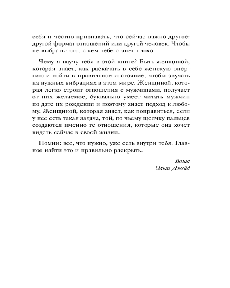 💳 Оплатить за товар можно при получении 🇰🇿 Есть бесплатная доставка по Казахстану от 1 дня 🎁 Копите бонусы с каждой покупки Серия: Спасибо, Вселенная! «Ты моя родственная душа», «Как я счастлив, что мы вместе», «Ради тебя я готов на все» — такие слова мечтает услышать едва ли не каждая женщина. Но в реальности найти того самого идеального мужчину необычайно сложно. Ольга Джейд, астропсихолог, женский наставник и автор бестселлера «Код королевы», рассказывает, как стать той, которая очаровывает и влюбляет в себя мужчин по щелчку пальцев. Весь секрет в том, что притягательной женщину делает не красота или ум, а энергия. Эта книга предлагает программу прокачки всех уровней женской энергии и раскрытия энергетической воронки. А еще — работу с женскими состояниями, такими как роскошная женщина, проявленная женщина, сексуальная женщина и др. Благодаря этому вы сможете легко строить отношения и получать от мужчин все, что душе угодно. |