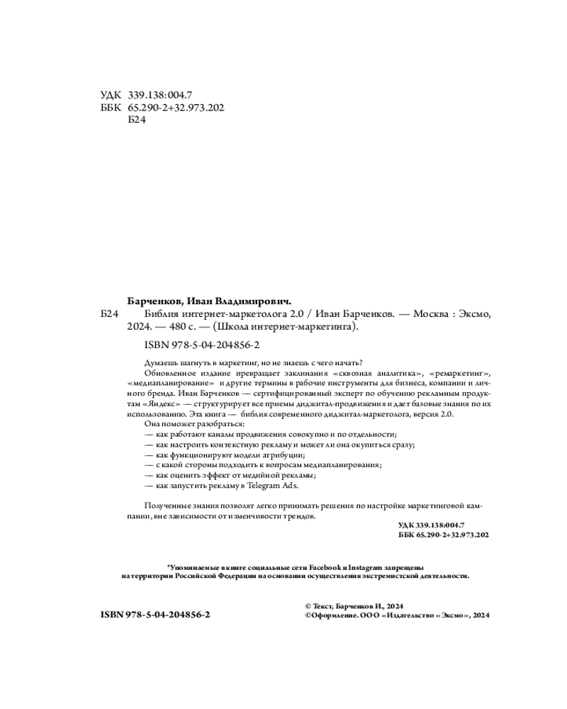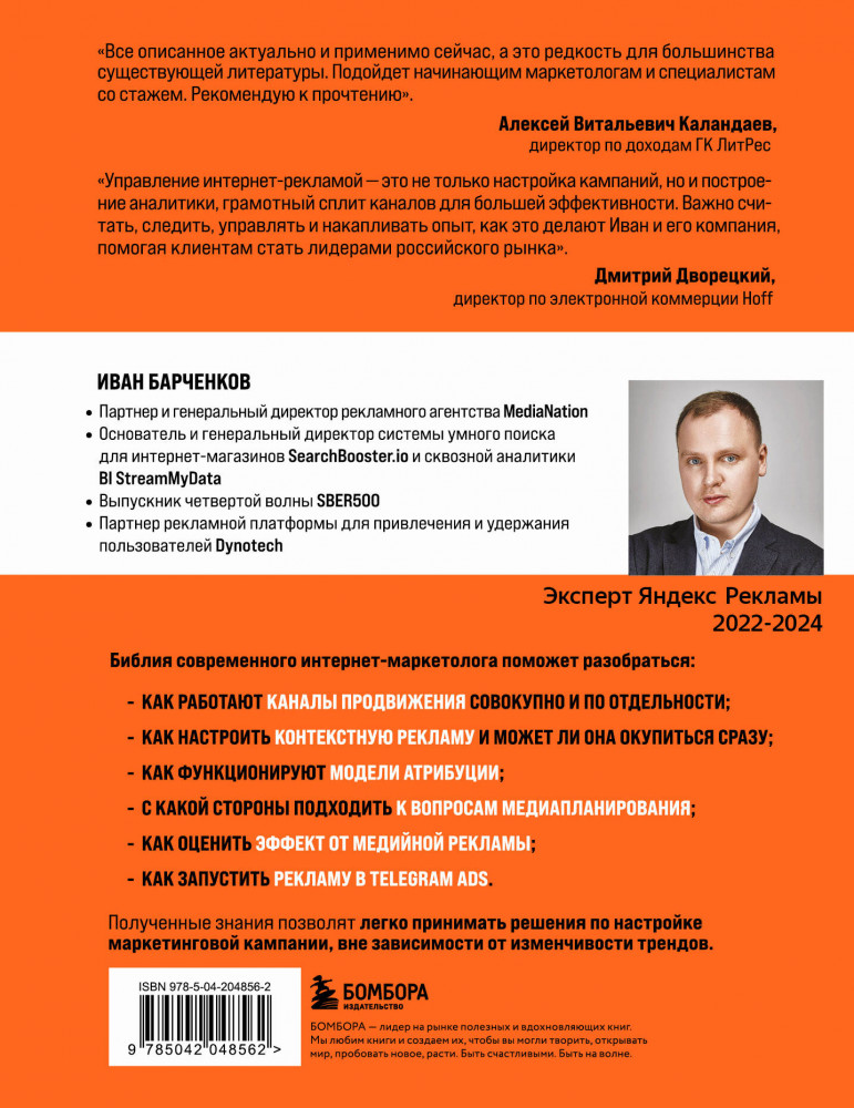💳 Оплатить за товар можно при получении 🇰🇿 Есть бесплатная доставка по Казахстану от 1 дня 🎁 Копите бонусы с каждой покупки Серия: Школа интернет-маркетинга. Просто, эффективно, прибыльно Думаешь шагнуть в маркетинг, но не знаешь, с чего начать? Обновленное издание превращает заклинания «сквозная аналитика», «ремаркетинг», «медиапланирование» и другие термины в рабочие инструменты для бизнеса, компании и личного бренда. Иван Барченков — сертифицированный эксперт по обучению рекламным продуктам Яндекс — структурирует все приемы диджитал-продвижения и дает базовые знания по их использованию. Эта книга — библия современного диджитал-маркетолога, версия 2.0. Полученные знания позволят легко принимать решения по настройке маркетинговой кампании, вне зависимости от изменчивости трендов. |