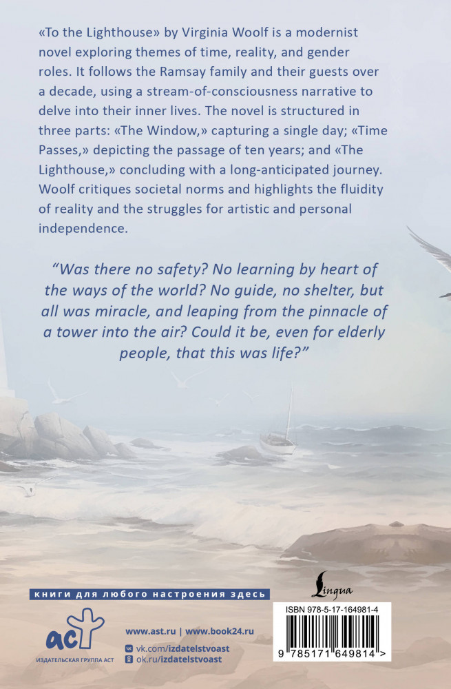 💳 Оплатить за товар можно при получении 🇰🇿 Есть бесплатная доставка по Казахстану от 1 дня 🎁 Копите бонусы с каждой покупки Серия: Exclusive Classics Hardcover «На маяк» — роман английской писательницы Вирджинии Вулф, опубликованный в 1927 году. Произведение является классическим примером модернистской литературы, использующей такие приемы, как поток сознания и смена точек зрения персонажей. Действие романа разворачивается на острове Скай в Шотландии и охватывает временной промежуток до, во время и после Первой мировой войны. Центральными персонажами являются члены семьи Рэмзи и их друзья, которые приезжают на летний отдых в загородный дом. В центре повествования — планируемая поездка на маяк, которая откладывается на неопределенный срок и становится символом мечты и недостижимости. |