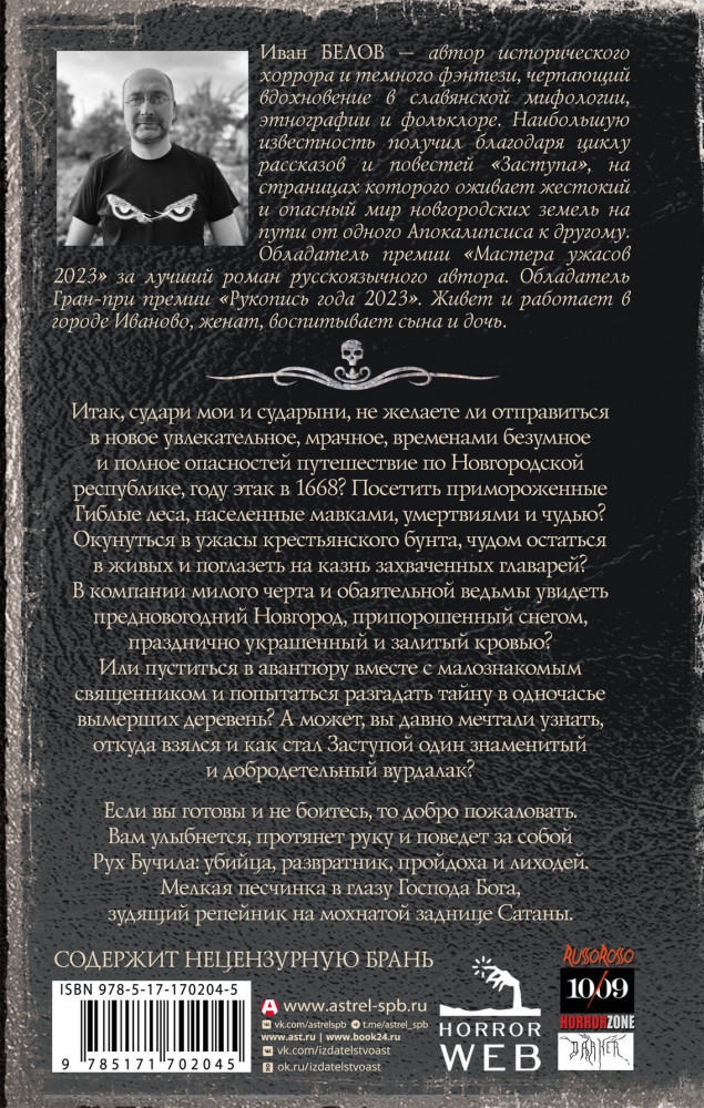 💳 Оплатить за товар можно при получении 🇰🇿 Есть бесплатная доставка по Казахстану от 1 дня 🎁 Копите бонусы с каждой покупки Серия: Самая страшная книга Итак, судари мои и сударыни, не желаете ли отправиться в новое увлекательное, мрачное, временами безумное и полное опасностей путешествие по Новгородской республике, году этак в 1668? Посетить примороженные Гиблые леса, населенные мавками, умертвиями и чудью? Окунуться в ужасы крестьянского бунта, чудом остаться в живых и поглазеть на казнь захваченных главарей? В компании милого черта и обаятельной ведьмы увидеть предновогодний Новгород, припорошенный снегом, празднично украшенный и залитый кровью? Или пуститься в авантюру вместе с малознакомым священником и попытаться разгадать тайну в одночасье вымерших деревень? А может, вы давно мечтали узнать, откуда взялся и как стал Заступой один знаменитый и добродетельный вурдалак? |