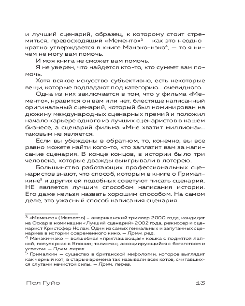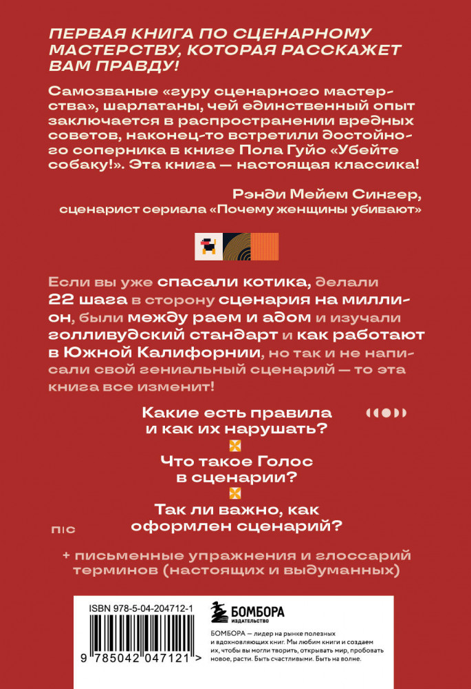 💳 Оплатить за товар можно при получении 🇰🇿 Есть бесплатная доставка по Казахстану от 1 дня 🎁 Копите бонусы с каждой покупки Серия: Пиши и сочиняй. Книги по сценарному и писательскому мастерству Если вы в поиске книги о том, как писать сценарии, то скорее всего вы уже видели или даже читали «Спасите котика!», «История на миллион долларов», «Анатомия истории: 22 шага к созданию успешного сценария», «Голливудский стандарт» и другие бестселлеры в этом разделе. Эти книги признаны классикой всех сценарных школ мира. И всё же... Вы всё ещё в поиске той самой книги, которая вам ДЕЙСТВИТЕЛЬНО поможет. Что ж, это она! Ваши поиски закончены! В своей книге «Убейте пса! Или Первая правдивая книга о сценариях» Пол Гуйо честно говорит о работе сценариста и бесстрашно разносит всех, кто сам сценарии писать не умеет, но активно этому учит. Никакой воды! Только правда! |