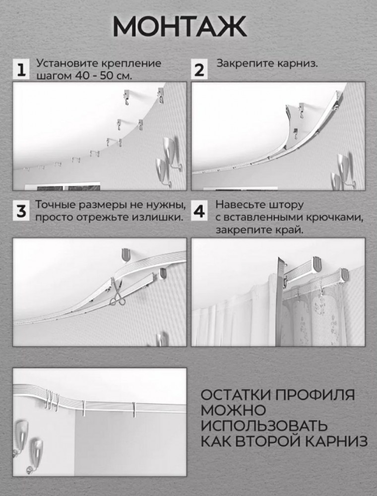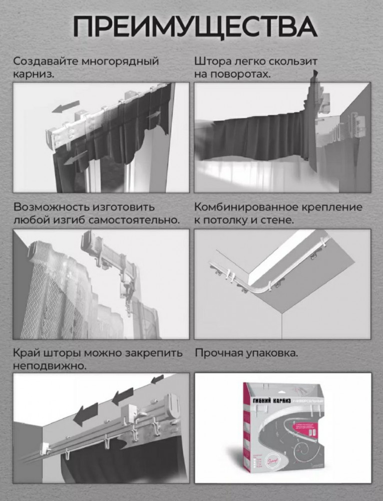 💳 Оплатить за товар можно при получении 🇰🇿 Есть бесплатная доставка по Казахстану от 1 дня 🎁 Копите бонусы с каждой покупки Гибкий карниз потолочный для штор — инновация в карнизах для эркеров, возможность создания многорядных карнизов любой конфигурации, для сложных штор и квартир с радиусными стенами. Монтаж к стене или потолку. Профиль гибкого карниза сочетает в себе максимальную вертикальную жесткость для самых тяжелых штор и горизонтальную гибкость для возможности изгибании даже с самыми малыми радиусами. Гибкий карниз идеален для установки в эркер, используется для декора балконов и лоджий любых форм, подходит для дизайнерских решений зонирования пространства и декорирования стен тканью, шторами нитями. Это отличное функциональное и экономичное решение для квартиры, дачи, загородного дома или коттеджа. |