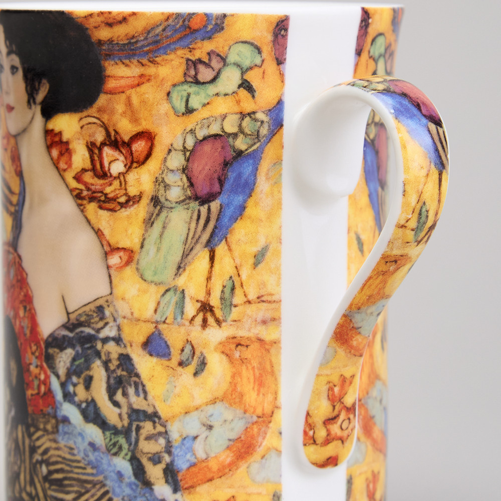 Очень красивая кружка! Фарфор в меру тонкий,.яркий сюжет с картины Климта хочется рассматривать и рассматривать, а красный веер это что-то. Это моя удачная покупка, теперь она моя любимая кружка. Хорошее настроение после чаепития гарантирована!