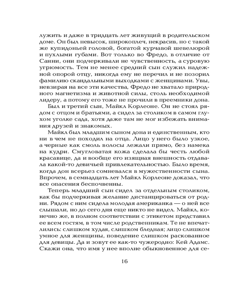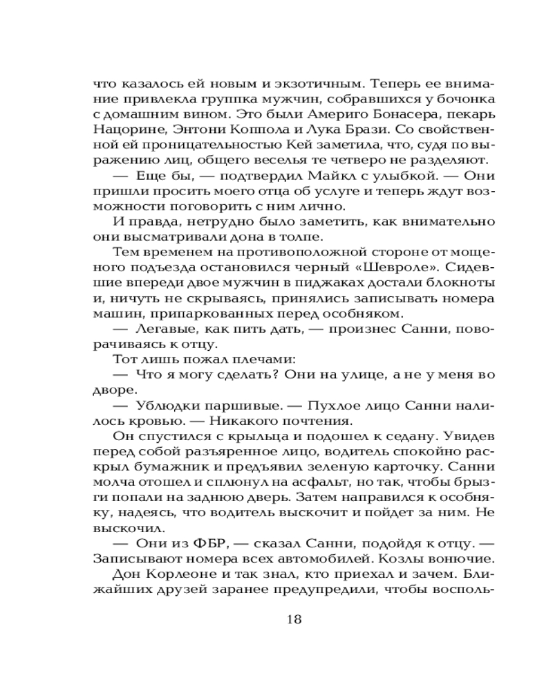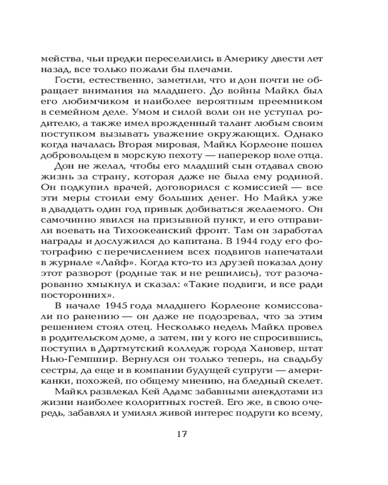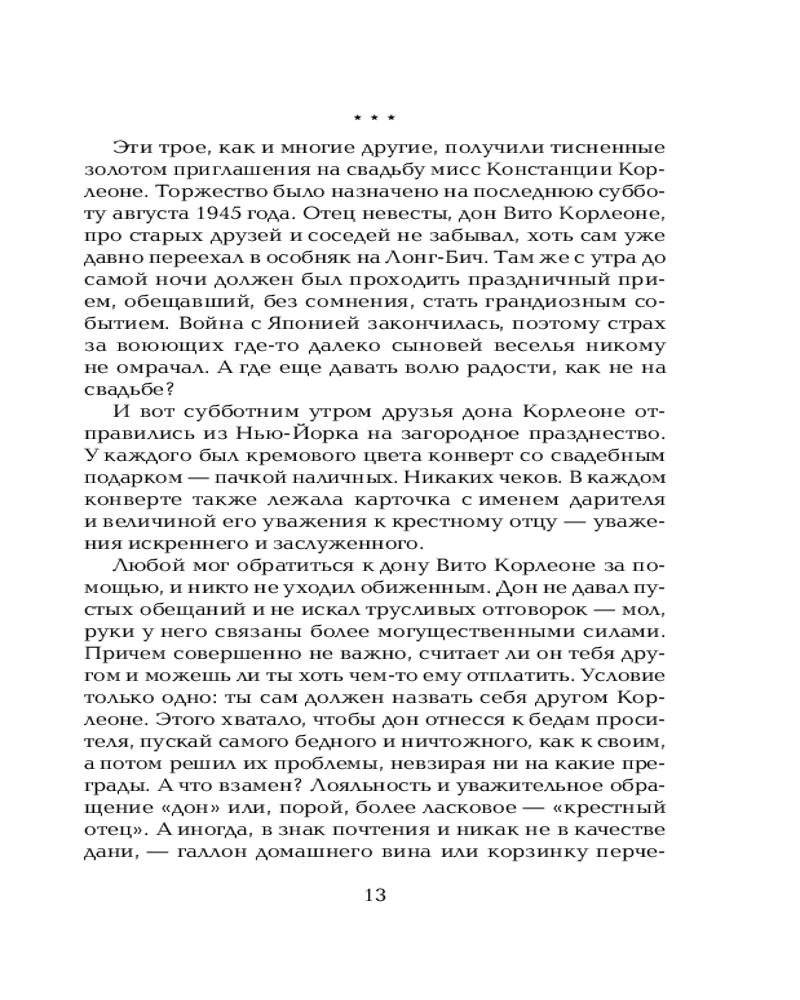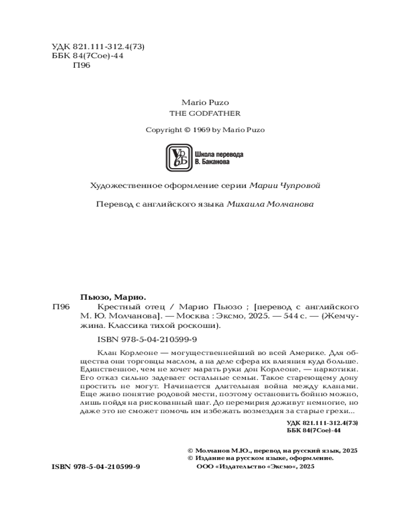 💳 Оплатить за товар можно при получении 🇰🇿 Есть бесплатная доставка по Казахстану от 1 дня 🎁 Копите бонусы с каждой покупки Серия: Жемчужина. Классика тихой роскоши Каждая книга серии — это литературная жемчужина. Марио Пьюзо вошел в историю мировой литературы благодаря роману «Крестный отец». Сюжетом книги заинтересовались кинематографисты. Пьюзо написал сценарий, а Фрэнсис Форд Коппола снял фильм с Марлоном Брандо и Аль Пачино в главных ролях. Корлеоне — один из могущественнейших кланов Америки. Подпольная империя управляется членами семьи. Только младший сын дона Корлеоне, Майкл, идет наперекор отцу. Он хочет спокойно жить со своей возлюбленной и не иметь ничего общего с мафией. Однако не так просто отдалиться от семейных дел, если ты Корлеоне. Майкл оказывается втянут в войну между кланами. У него только два пути: стать пешкой в руках врагов или преступить через себя и стать убийцей... |