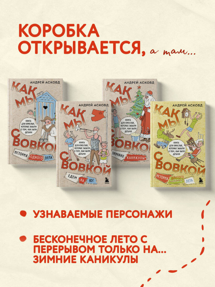 Серия четырех озорных романов от автора бестселлеров Андрея Асковда, которые возвращают нас в детство, — теперь в одном подарочном наборе. Автор рассказывает о проделках ребят так легко и весело, что оторваться от чтения невозможно. Но зачитавшись — будьте аккуратны. Не распугайте смехом домочадцев. Яркие образы, узнаваемые персонажи, бесконечное лето с перерывом только на... зимние каникулы — что еще нужно для того, чтобы полностью погрузиться с головой в этот отличный книжный сериал. Приготовьтесь к тому, что ваши дети тоже захотят почитать эти книги и будут буквально вырывать их у вас из рук.