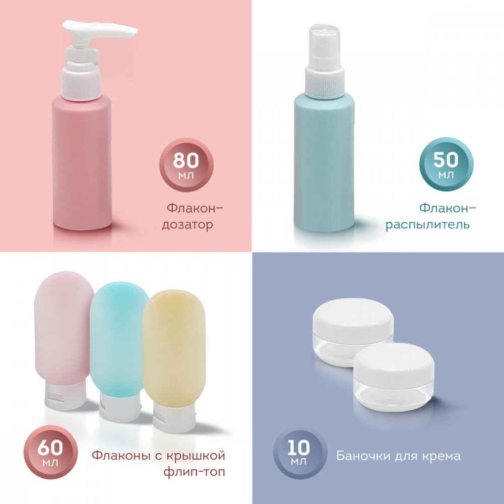 💳 Оплатить за товар можно при получении 🇰🇿 Есть бесплатная доставка по Казахстану от 1 дня 🎁 Копите бонусы с каждой покупки Дорожный набор пластиковых флаконов идеально подойдет для путешествия, тренажерного зала, роддома, бассейна и любой другой ситуации, когда вы вдали от дома. |