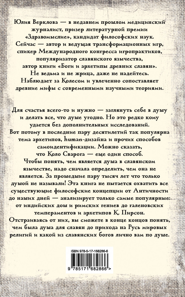 💳 Оплатить за товар можно при получении 🇰🇿 Есть бесплатная доставка по Казахстану от 1 дня 🎁 Копите бонусы с каждой покупки Серия: Лучшая историческая книга Юлия Верклова — в недавнем прошлом медицинский журналист, призер литературной премии «Здравомыслие», кандидат философских наук. Сейчас — автор и ведущая трансформационных игр, спикер Международного конгресса игропрактиков, популяризатор славянского язычества, автор книги «Боги и архетипы древних славян». Для счастья всего-то и нужно — заглянуть себе в душу и делать все, что душе угодно. Но это редко кому удается без дополнительных исследований. Вот потому в последние пару десятилетий так популярна тема архетипов, human-дизайна и прочих способов самоидентификации. Можно сказать, что Коло Сварога — еще один способ. |