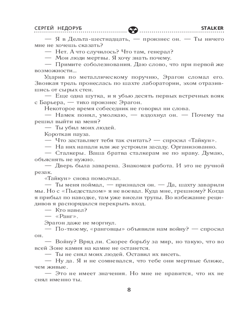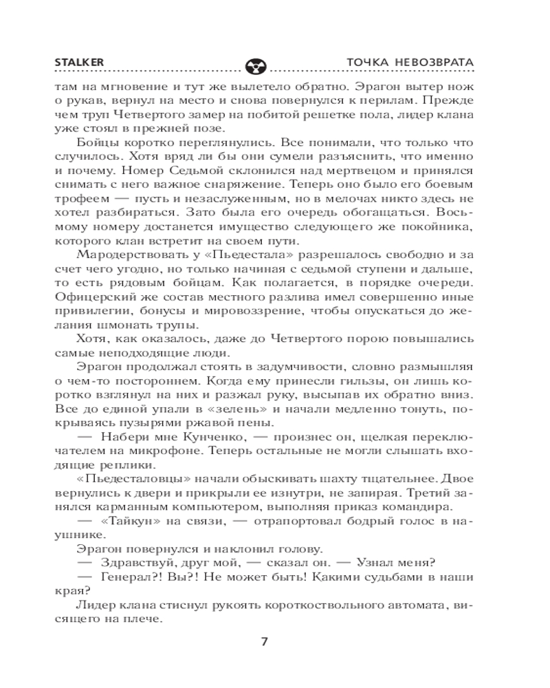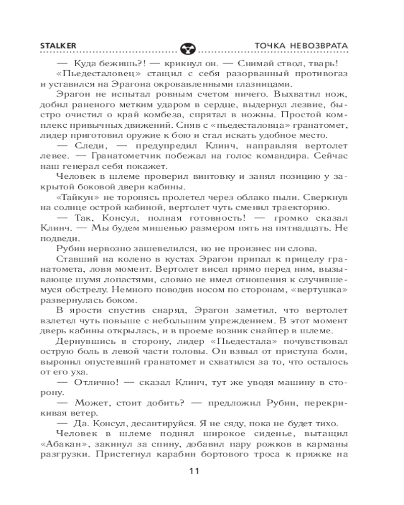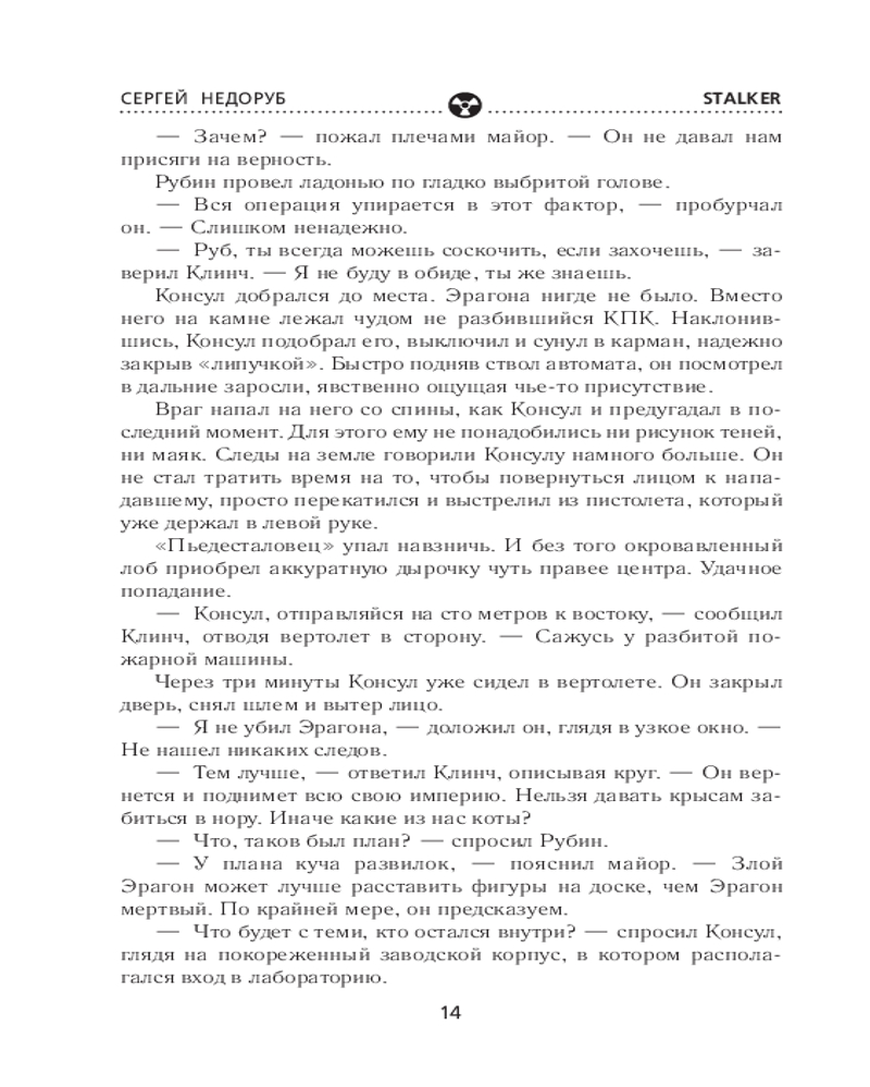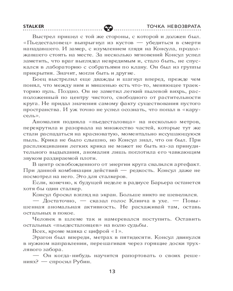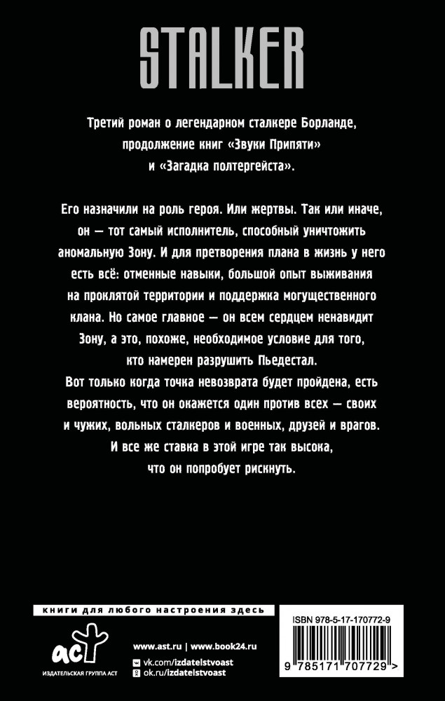 💳 Оплатить за товар можно при получении 🇰🇿 Есть бесплатная доставка по Казахстану от 1 дня 🎁 Копите бонусы с каждой покупки Серия: Stalker Третий роман о легендарном сталкере Борланде, продолжение книг «Звуки Припяти» и «Загадка полтергейста». Его назначили на роль героя. Или жертвы. Так или иначе, он — тот самый исполнитель, способный уничтожить аномальную Зону. И для претворения плана в жизнь у него есть всё: отменные навыки, большой опыт выживания на проклятой территории и поддержка могущественного клана. Но самое главное — он всем сердцем ненавидит Зону, а это, похоже, необходимое условие для того, кто намерен разрушить Пьедестал. Вот только когда точка невозврата будет пройдена, есть вероятность, что он окажется один против всех — своих и чужих, вольных сталкеров и военных, друзей и врагов. И все же ставка в этой игре так высока, что он попробует рискнуть. |