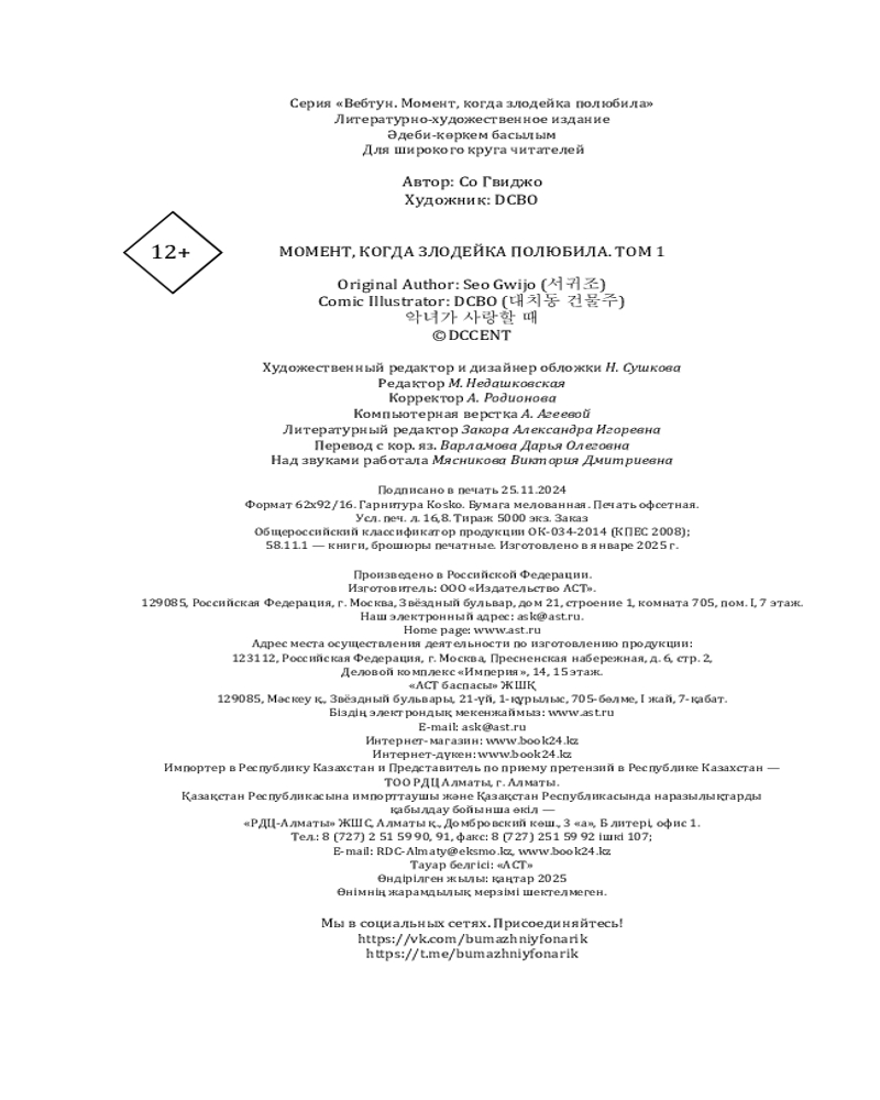 💳 Оплатить за товар можно при получении 🇰🇿 Есть бесплатная доставка по Казахстану от 1 дня 🎁 Копите бонусы с каждой покупки Серия: Вебтун. Момент, когда злодейка полюбила Главная героиня перерождается в теле принцессы Лифелии, известной злодейки, чья судьба заканчивается трагической смертью в тюрьме. Однако только ей известно, что Лифелия страдает от неизлечимой болезни. Чтобы изменить предначертанное, героине предстоит не только избежать гибели и исцелить доставшуюся ей от Лифелии болезнь, но и спасти любимых персонажей, погибших из-за принца Равилофа. Для широкого круга читателей. |