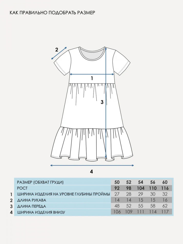 Платье для девочки выполнено из кулира — лёгкого хлопкового полотна. Изделие трапециевидного силуэта, отрезное по талии, с короткими рукавами, юбка украшена широким воланом.