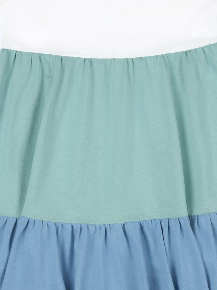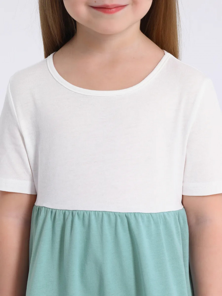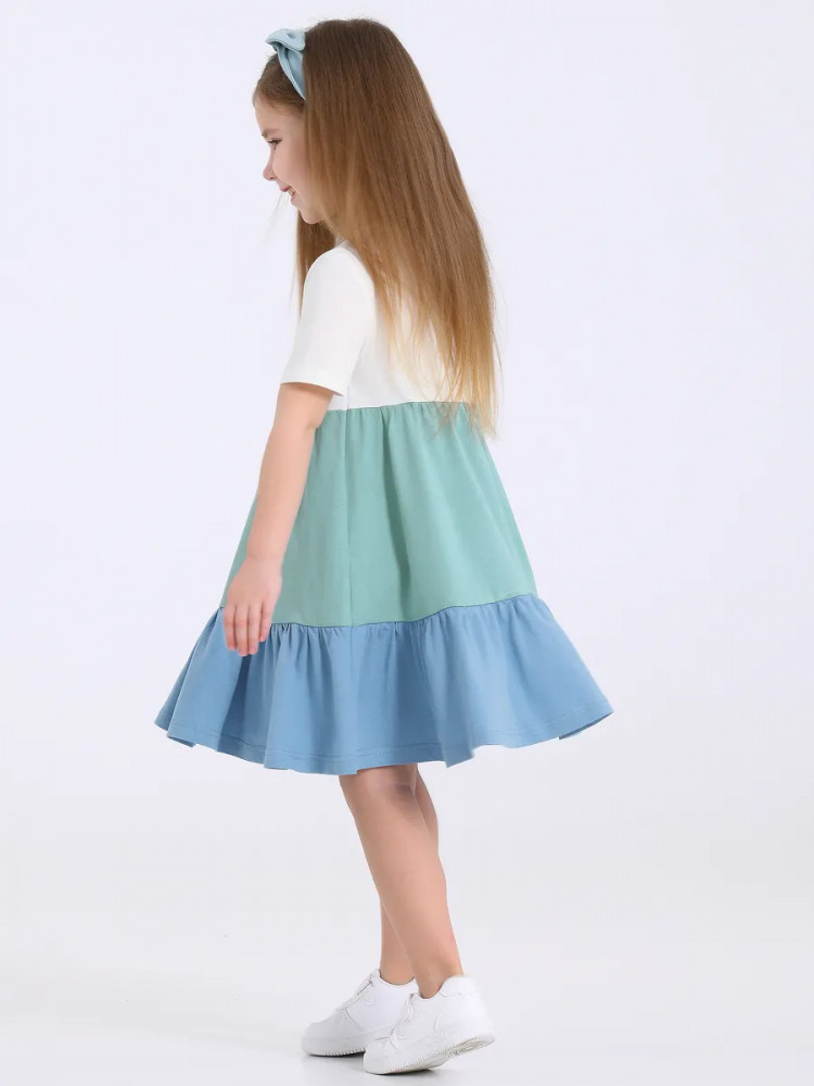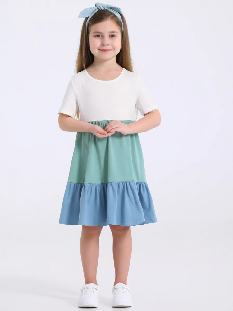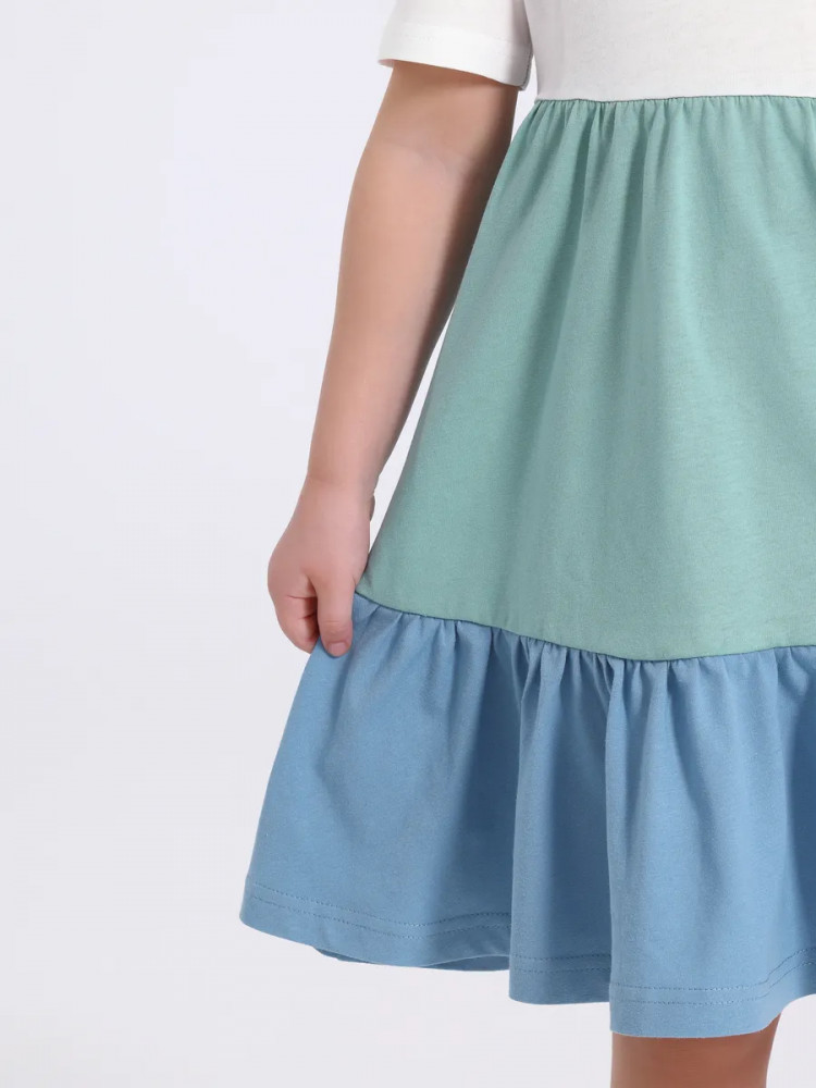 Платье для девочки выполнено из кулира — лёгкого хлопкового полотна. Изделие трапециевидного силуэта, отрезное по талии, с короткими рукавами, юбка украшена широким воланом.