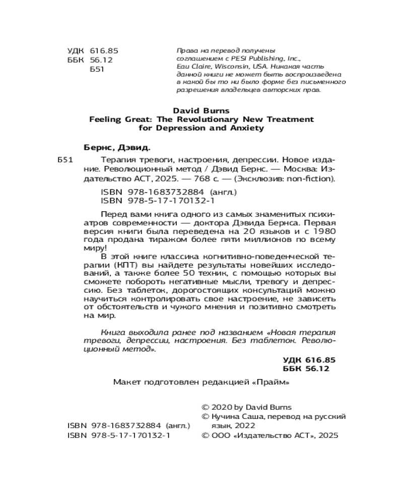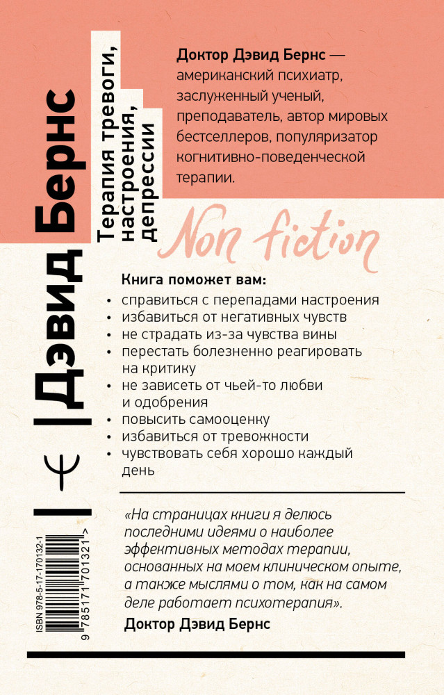 💳 Оплатить за товар можно при получении 🇰🇿 Есть бесплатная доставка по Казахстану от 1 дня 🎁 Копите бонусы с каждой покупки Серия: Эксклюзив: non-fiction Доктор Дэвид Бернс — американский психиатр, заслуженный ученый, преподаватель, автор мировых бестселлеров, популяризатор когнитивно-поведенческой терапии. Перед вами самое последнее, дополненное издание классической работы Дэвида Бернса, основанное на новейших исследованиях в области психологии. В книге более 50 техник, с помощью которых вы сможете побороть негативные мысли и вызванные ими тревогу и подавленное настроение. Новые методы помогут развить чувство радости и позитивное отношение к себе и жизни. |