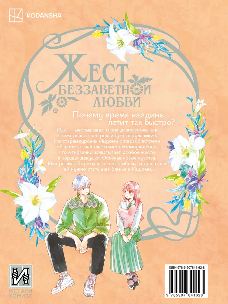 Серия: Жест беззаветной любви Почему время наедине летит так быстро? Юки — неслышащая, и она давно привыкла к тому, как на неё реагируют окружающие. Но старшекурсник Ицуоми с первой встречи общается с ней настолько непринуждённо, что мгновенно захватывает особое место в сердце девушки. Осознав новые чувства, Юки решила бороться за свою любовь, и для этого ей нужно стать ещё ближе к Ицуоми... |