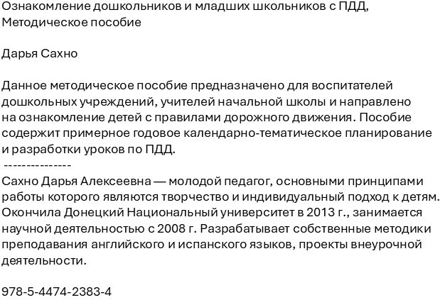 Ознакомление дошкольников и младших школьников с ПДД. Методическое пособиеВ данный момент этот товар отсутствует в продаже. Возможно, у нас найдется аналогичный или похожий товар здесь. Данное методическое пособие предназначено для воспитателей дошкольных учреждений, учителей начальной школы и направлено на ознакомление детей с правилами дорожного движения. Пособие содержит примерное годовое календарно-тематическое планирование и разработки уроков по ПДД. Сахно Дарья Алексеевна — молодой педагог, основными принципами работы которого являются творчество и индивидуальный подход к детям. Окончила Донецкий Национальный университет в 2013 г., занимается научной деятельностью с 2008 г. Разрабатывает собственные методики преподавания английского и испанского языков, проекты внеурочной деятельности. |