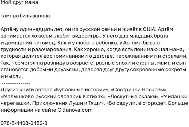 Мой друг мамаВ данный момент этот товар отсутствует в продаже. Возможно, у нас найдется аналогичный или похожий товар здесь. Артёму одиннадцать лет, он из русской семьи и живёт в США. Артём занимается хоккеем, любит видеоигры. У него два младших брата и домашний питомец. Как и у любого ребёнка, у Артёма бывают трудности и разочарования. Как хорошо, когда есть понимающая мама, которая делится воспоминаниями о детстве, переживаниями и страхами. Так, несмотря на разницу в возрасте, разные эпохи и страны, мама и сын становятся добрыми друзьями, доверяя друг другу сокровенные секреты и мысли. |