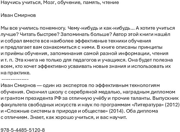 Научись учиться. Мозг, обучение, память, чтениеВ данный момент этот товар отсутствует в продаже. Возможно, у нас найдется аналогичный или похожий товар здесь. Мы все учились понемногу. Чему-нибудь и как-нибудь... А хотите учиться лучше? Читать быстрее? Запоминать больше? Автор этой книги нашёл и собрал вместе все наиболее эффективные техники обучения и предлагает вам ознакомиться с ними. В книге описаны принципы и приёмы обучения, запоминания самой разной информации, чтения и т. п. Эта книга не только для педагогов и учащихся. Она будет полезна всем, кто хочет эффективно усваивать новые знания и использовать их на практике. |