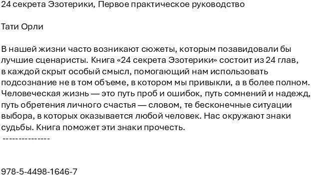 24 секрета Эзотерики. Первое практическое руководствоВ данный момент этот товар отсутствует в продаже. Возможно, у нас найдется аналогичный или похожий товар здесь. В нашей жизни часто возникают сюжеты, которым позавидовали бы лучшие сценаристы. Книга «24 секрета Эзотерики» состоит из 24 глав, в каждой скрыт особый смысл, помогающий нам использовать подсознание не в том объеме, в котором мы привыкли, а в более полном. Человеческая жизнь — это путь проб и ошибок, путь сомнений и надежд, путь обретения личного счастья — словом, те бесконечные ситуации выбора, в которых оказывается любой человек. Нас окружают знаки судьбы. Книга поможет эти знаки прочесть. |