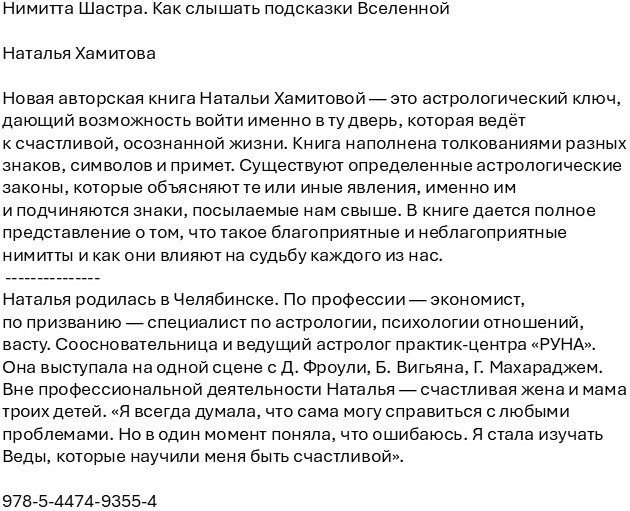 Нимитта Шастра. Как слышать подсказки ВселеннойВ данный момент этот товар отсутствует в продаже. Возможно, у нас найдется аналогичный или похожий товар здесь. Новая авторская книга Натальи Хамитовой — это астрологический ключ, дающий возможность войти именно в ту дверь, которая ведёт к счастливой, осознанной жизни. Книга наполнена толкованиями разных знаков, символов и примет. Существуют определенные астрологические законы, которые объясняют те или иные явления, именно им и подчиняются знаки, посылаемые нам свыше. В книге дается полное представление о том, что такое благоприятные и неблагоприятные нимитты и как они влияют на судьбу каждого из нас. |