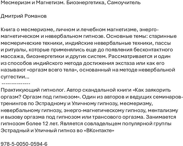 Месмеризм и Магнетизм. Биоэнергетика. СамоучительВ данный момент этот товар отсутствует в продаже. Возможно, у нас найдется аналогичный или похожий товар здесь. Книги по эзотерике открывают путь к познанию скрытых законов Вселенной, самопознанию и духовному развитию. Они охватывают широкий спектр тем — от древних мистических учений и практик медитации до астрологии, целительства и осознанных сновидений. Эти книги помогают расширить границы восприятия, понять связь между материей и энергией, раскрыть потенциал интуиции и обрести гармонию с миром. Подходя как к новичкам, так и к опытным исследователям духовных знаний, книги по эзотерике вдохновляют на внутренние открытия и осмысленную трансформацию жизни. Автор: Дмитрий Романов. |