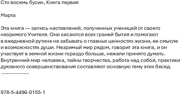 Сто восемь бусин. Книга перваяВ данный момент этот товар отсутствует в продаже. Возможно, у нас найдется аналогичный или похожий товар здесь. Эта книга — запись наставлений, полученных ученицей от своего незримого Учителя. Они касаются всех граней бытия и помогают в ежедневной рутине не забывать о главных ценностях жизни, ее смысле и возможностях души. Незримый мир рядом, говорит эта книга, и он участвует в земной жизни гораздо больше, нежели принято думать. Внутренний мир человека, тайны творчества, работа над собой, практики духовного совершенствования составляют основную тему этих бесед. |