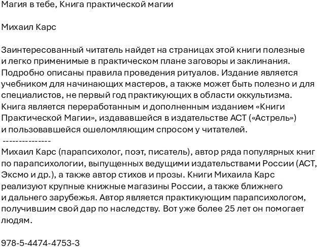 Магия в тебе. Книга практической магииВ данный момент этот товар отсутствует в продаже. Возможно, у нас найдется аналогичный или похожий товар здесь. Заинтересованный читатель найдет на страницах этой книги полезные и легко применимые в практическом плане заговоры и заклинания. Подробно описаны правила проведения ритуалов. Издание является учебником для начинающих мастеров, а также может быть полезно и для специалистов, не первый год практикующих в области оккультизма. Книга является переработанным и дополненным изданием «Книги Практической Магии», издававшейся в издательстве АСТ («Астрель») и пользовавшейся ошеломляющим спросом у читателей. |