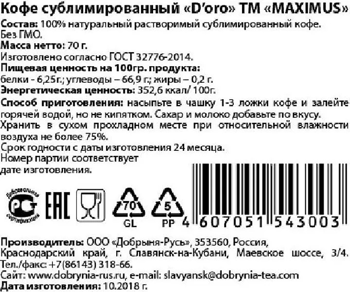 Maximus Кофе сублимированный в стеклянной кружке «D'oro»