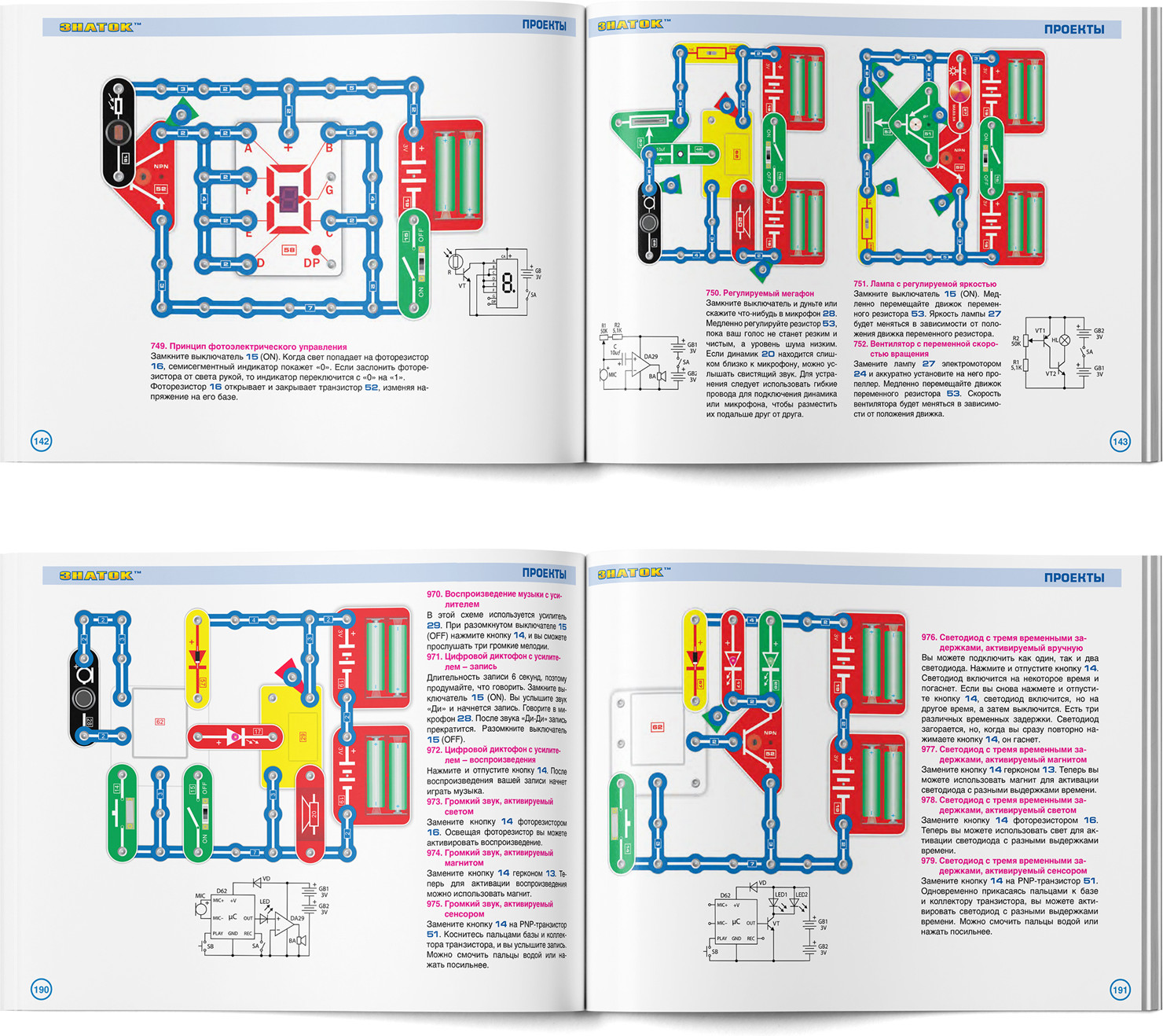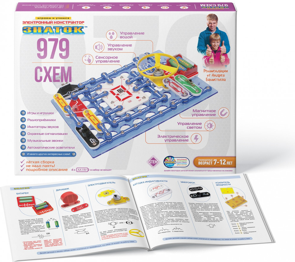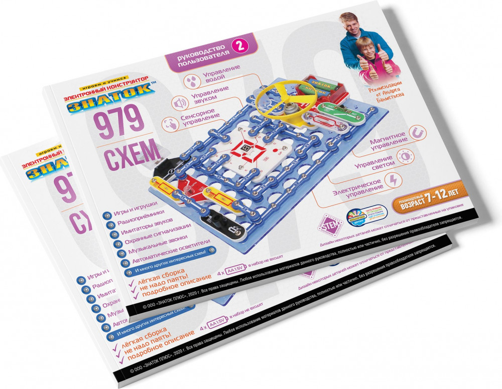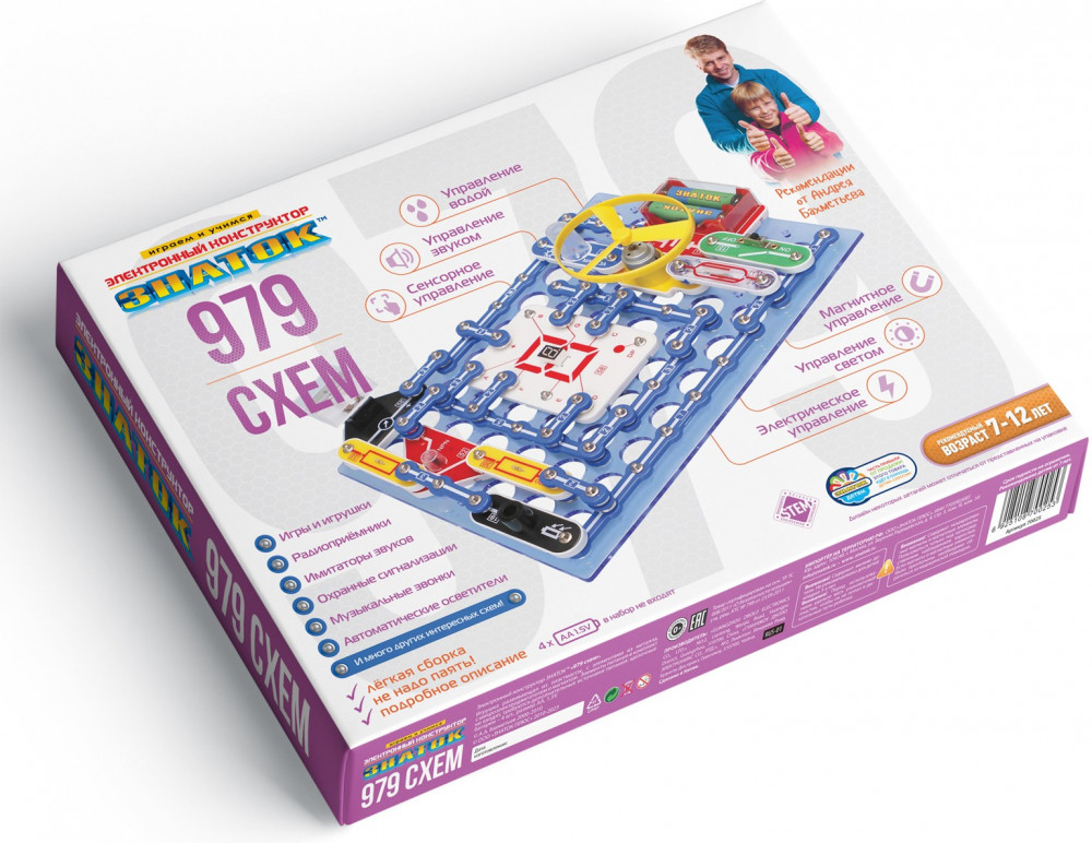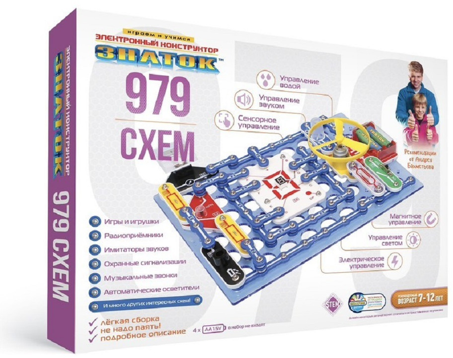 В данный момент этот товар отсутствует в продаже. Возможно, у нас найдется аналогичный или похожий товар здесь. Электронный конструктор «979 схем» среднего по сложности уровня, познакомит с удивительным миром электроники. Даже без помощи взрослых, используя очень понятное цветное руководство, всего за несколько минут, он или она смогут собрать и испытать схему с практически 100% положительным результатом и удивить родителей, друзей, учителей!