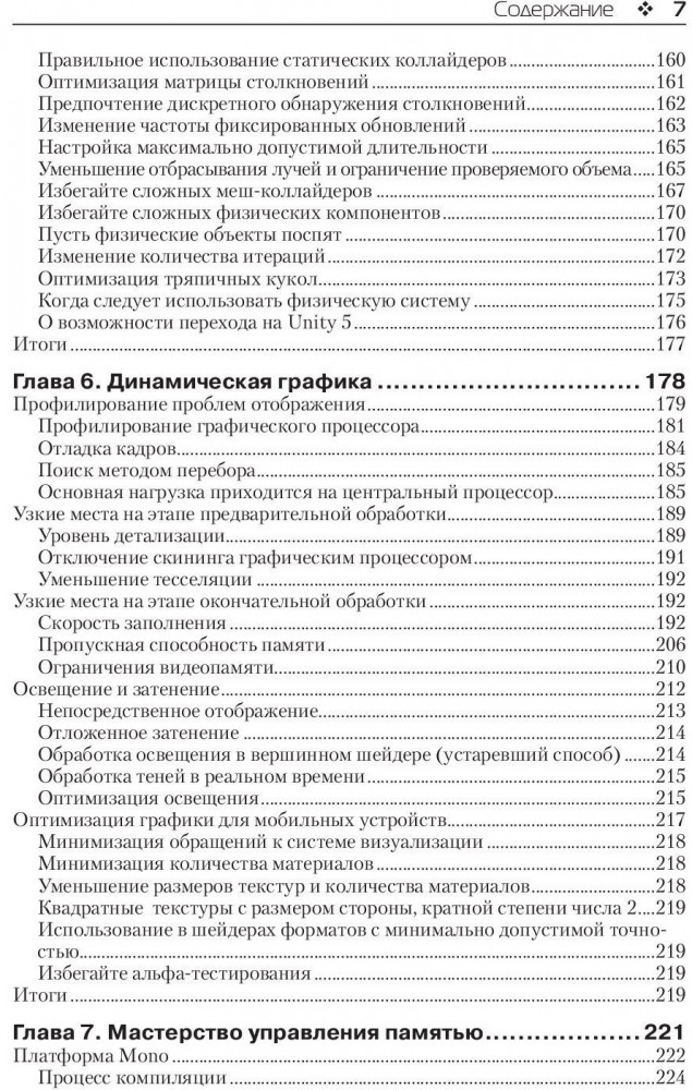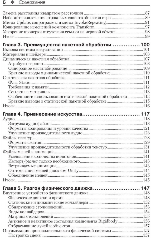 В данный момент этот товар отсутствует в продаже. Возможно, у нас найдется аналогичный или похожий товар здесь. Широкое распространение фреймворков для разработки игр, таких как Unity3D, породило острую конкуренцию в игровой индустрии. Ничто так не отпугивает игроков, как сбои при выполнении игры. Задержки при вводе, медленное отображения, физические нестыковки, подергивание, замирание и неожиданное аварийное завершение превращают игру в кошмар, и разработчики игр должны сделать все, чтобы этого никогда не происходило. В этой книге автор рассматривает основные характеристики движка Unity3D и знакомит читателя со способами улучшения производительности игровых приложений. Из этой книги вы узнаете, как выявлять и исследовать узкие места во всех основных компонентах движка Unity3D. В каждом конкретном случае описываются способы идентификации проблем, порядок выявления их причин и ряд возможных решений.