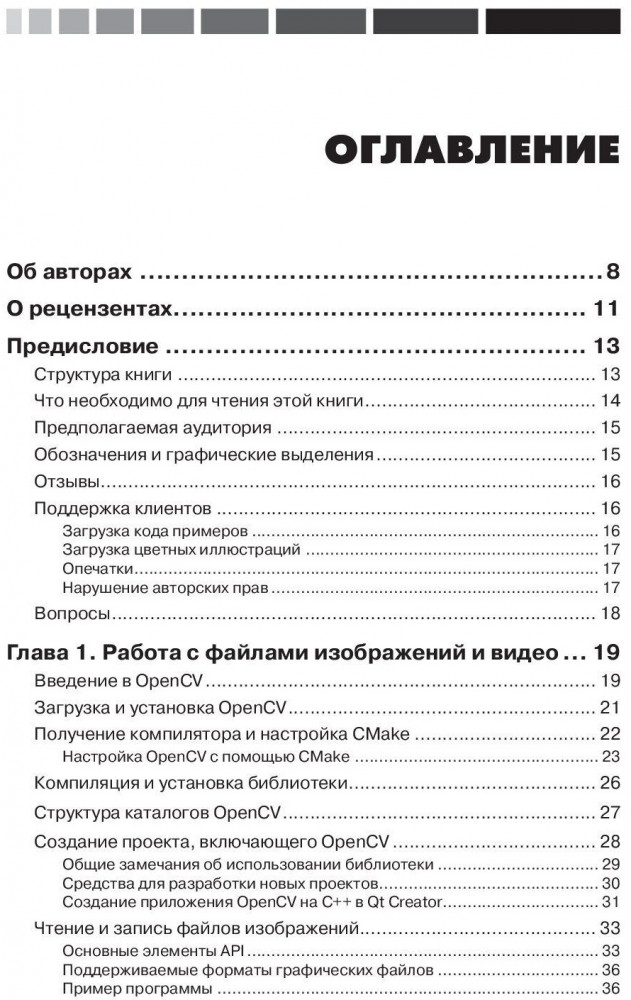 В данный момент этот товар отсутствует в продаже. Возможно, у нас найдется аналогичный или похожий товар здесь. OpenCV является наиболее широко распространенной библиотекой компьютерного зрения. Она включает сотни готовых функций обработки изображений и используется как в академических учреждениях, так и в промышленности. В этой книге на примерах демонстрируются основные алгоритмы обработки изображений, реализованные в OpenCV.