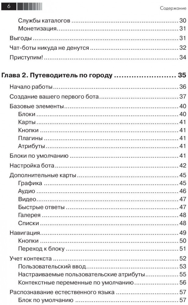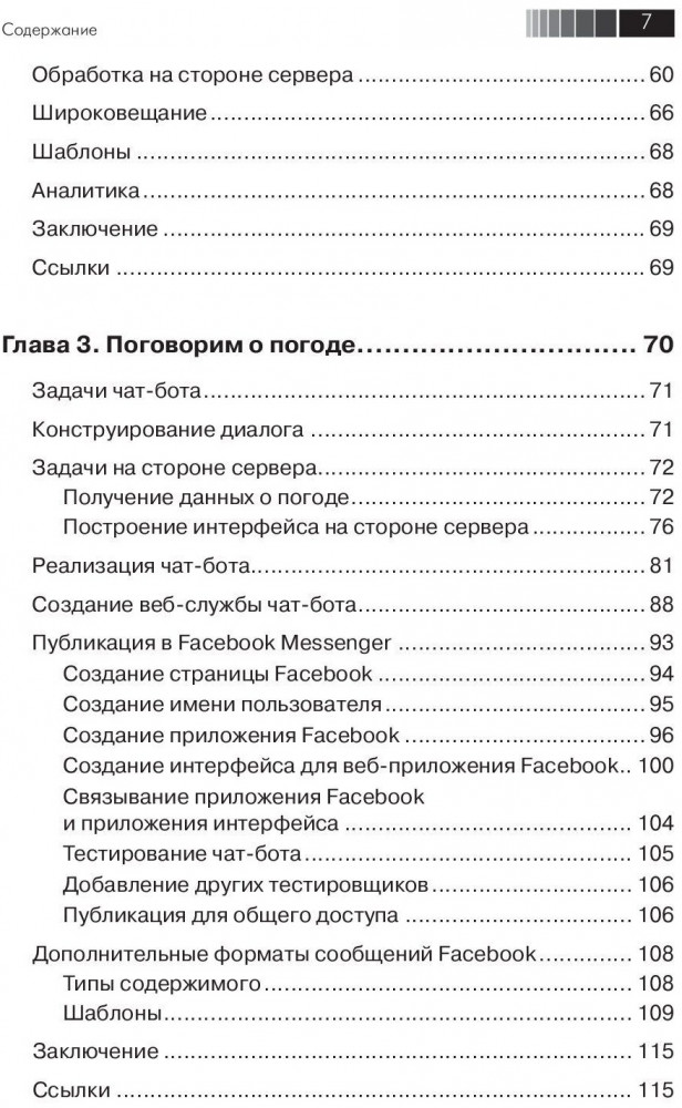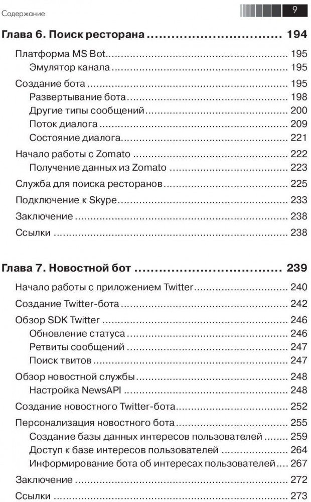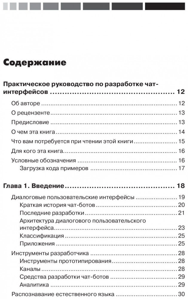 Мы начнем с разработки простого бота-мессенджера на основе API Facebook Messenger, чтобы понять основы их конструирования. Затем мы перейдем к проектированию модели задач, для реализации сложные решений, таких, как заказ и планирование, используя платформы Google Dialogflow и Microsoft Bot Framework. Затем мы займемся голосовыми пользовательскими интерфейсами, способными взаимодействовать с пользователями с помощью речи, используя устройства Amazon Echo и Google Home. К концу книги вы разработаете группу собственных чат-ботов и голосовых пользовательских интерфейсов для разных ведущих платформ. Издание будет полезно начинающим разработчикам в области искусственного интеллекта. |
