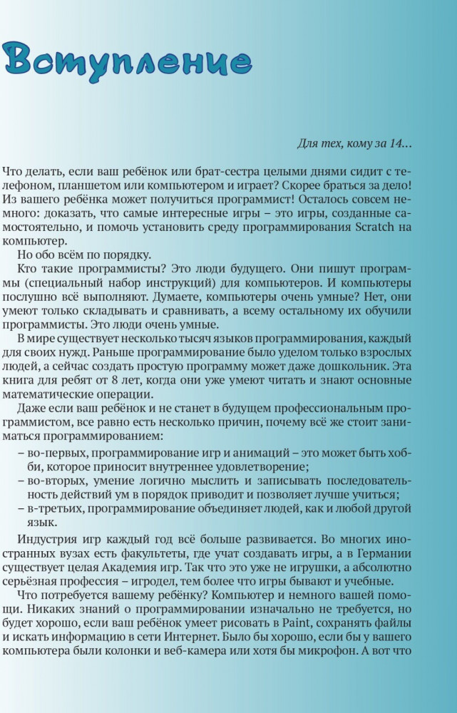 В данный момент этот товар отсутствует в продаже. Возможно, у нас найдется аналогичный или похожий товар здесь. Программирование — это вторая грамотность, грамотность XXI века. Визуальное программирование в среде Scratch позволяет развить творческое и алгоритмическое мышление, что обязательно пригодится в будущем, где уже практически не останется профессий, несвязанных с информационными технологиями и программированием.
