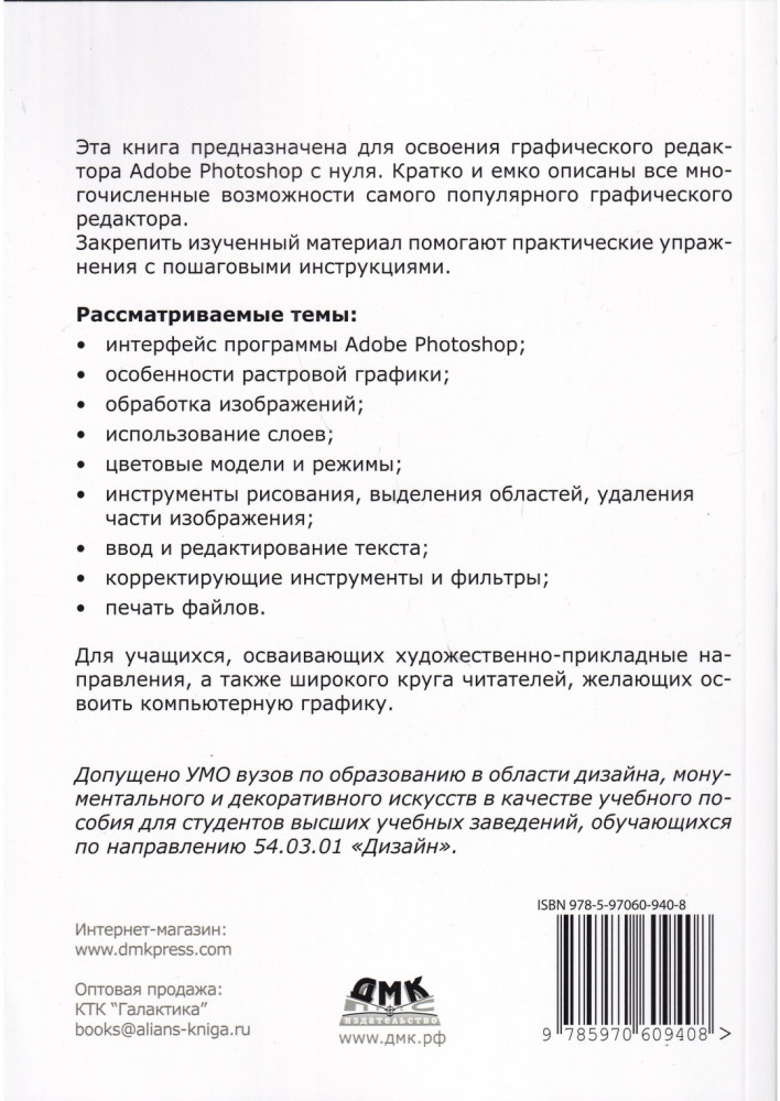 Основы графического дизайна в Photoshop 2021В данный момент этот товар отсутствует в продаже. Возможно, у нас найдется аналогичный или похожий товар здесь. Эта книга предназначена для освоения графического редактора Adobe Photoshop с нуля. Кратко и емко описаны все многочисленные возможности Photoshop. Закрепить изученный материал помогают практические упражнения с пошаговыми инструкциями. Для учащихся, осваивающих художественно-прикладные направления, а также широкого круга читателей, желающих освоить компьютерную графику. |