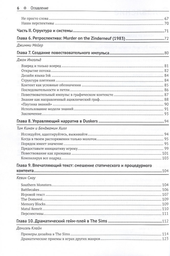 Игры — это интерактивный вид искусства, который предполагает тесное взаимодействие авторов, игроков и компьютера как средства генерирования объектов и сюжетных ходов. В своих статьях известные разработчики компьютерных игр описывают инструменты построения игрового мира, создания характеров, тем и общей атмосферы, приводя в пример собственные проекты и рассказывая о том, как преодолевались трудности в работе над ними. |
