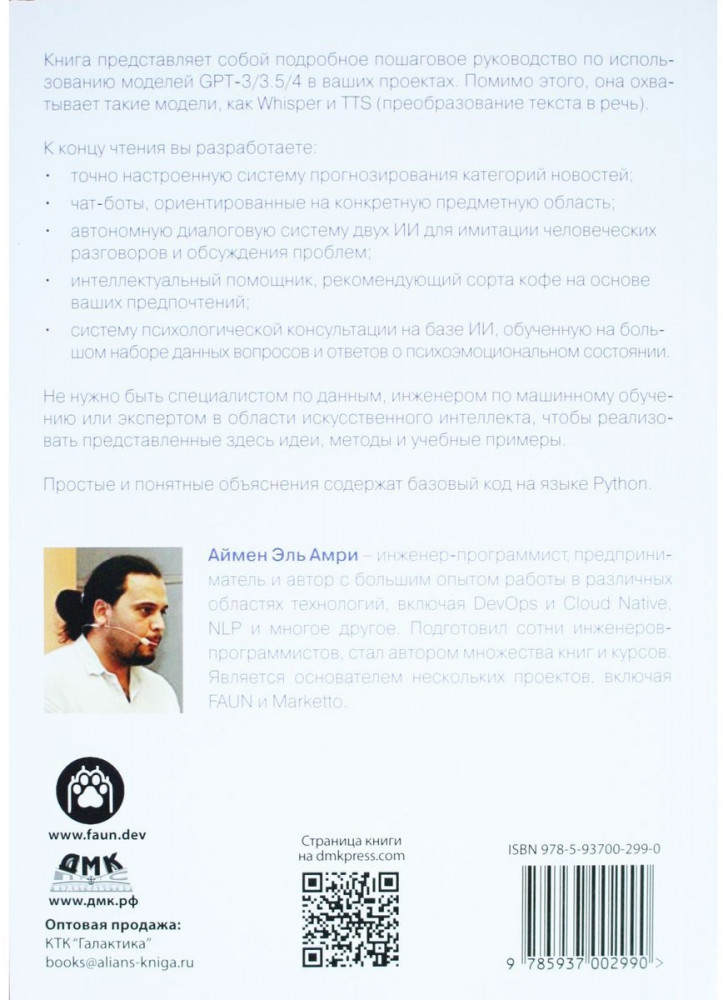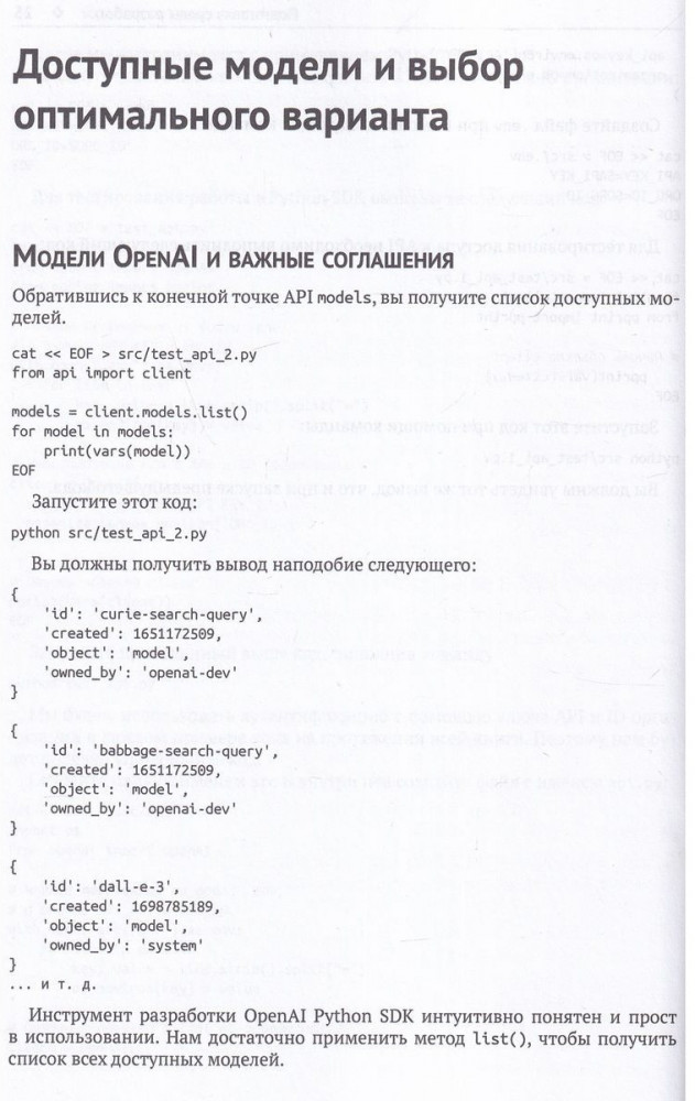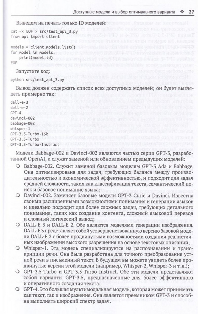 GPT-4. Руководство по использованию API Open AIВ данный момент этот товар отсутствует в продаже. Возможно, у нас найдется аналогичный или похожий товар здесь. Книга представляет собой подробное пошаговое руководство по использованию моделей GPT-3/3.5/4 в ваших проектах. Оно охватывает также такие модели как Whisper и ТTS (преобразование текста в речь). Не нужно быть специалистом по данным, инженером по машинному обучению или экспертом в области искусственного интеллекта, чтобы реализовать представленные здесь идеи, методы и учебные примеры. Простые и понятные объяснения содержат базовый код на языке Python. |