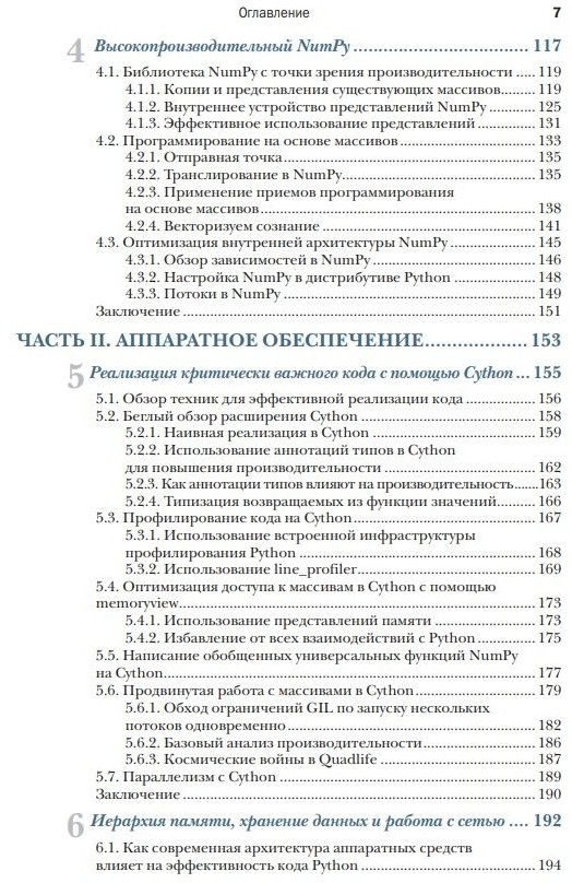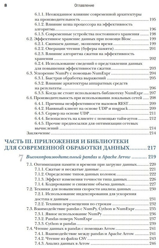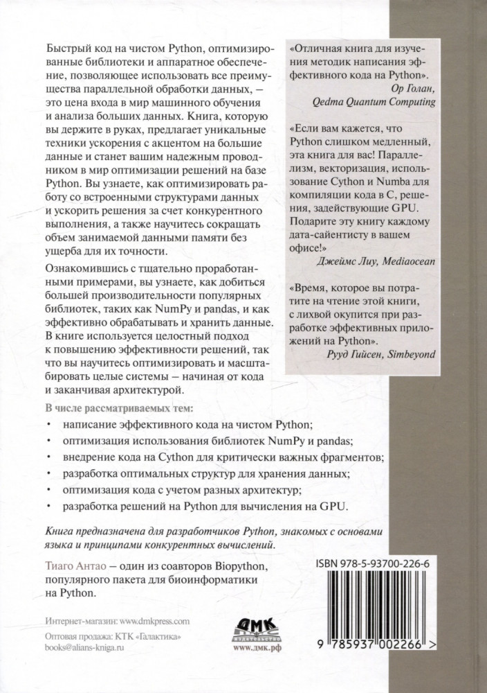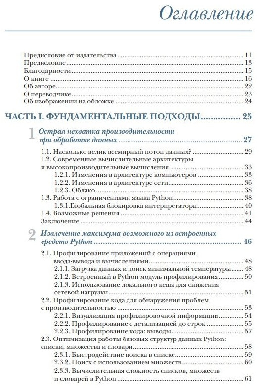 Ознакомившись с тщательно проработанными при-мерами, вы узнаете, как добиться большей производительности популярных библиотек, таких как NumPy и pandas, и как эффективно обрабатывать и хранить данные. В книге используется целостный подход к повышению эффективности решений, так что вы научитесь оптимизировать и масштабировать целые системы — начиная от кода и заканчивая архитектурой. |
