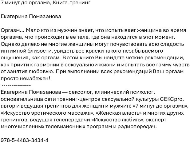 7 минут до оргазма. Книга-тренингВ данный момент этот товар отсутствует в продаже. Возможно, у нас найдется аналогичный или похожий товар здесь. Оргазм... Мало кто из мужчин знает, что испытывает женщина во время оргазма, что происходит в ее теле, где она находится в этот момент. Однако далеко не многие женщины могут почувствовать всю сладость интимной близости, увидеть все краски такого незабываемого ощущения, как оргазм. В этой книге Вы найдете четкие рекомендации, как прийти к гармонии в сексуальной жизни и испытать все гамму чувств от занятия любовью. При выполнении всех рекомендаций Ваш оргазм просто неизбежен! |