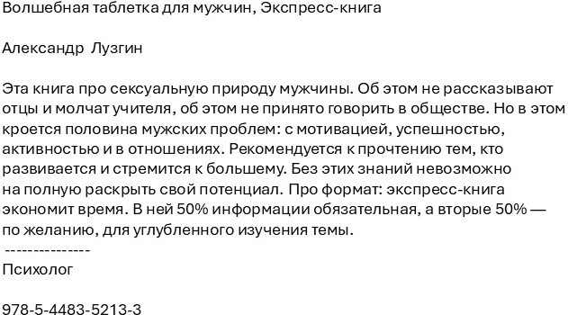 Волшебная таблетка для мужчинВ данный момент этот товар отсутствует в продаже. Возможно, у нас найдется аналогичный или похожий товар здесь. Эта книга про сексуальную природу мужчины. Об этом не рассказывают отцы и молчат учителя, об этом не принято говорить в обществе. Но в этом кроется половина мужских проблем: с мотивацией, успешностью, активностью и в отношениях. Рекомендуется к прочтению тем, кто развивается и стремится к большему. Без этих знаний невозможно на полную раскрыть свой потенциал. Про формат: экспресс-книга экономит время. В ней 50% информации обязательная, а вторые 50% — по желанию, для углубленного изучения темы. |