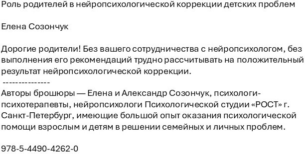 Роль родителей в нейропсихологической коррекции детских проблемЕлена Созончук, Александр Созончук В данный момент этот товар отсутствует в продаже. Возможно, у нас найдется аналогичный или похожий товар здесь. Дорогие родители! |