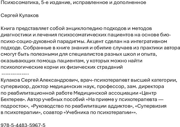 ПсихосоматикаВ данный момент этот товар отсутствует в продаже. Возможно, у нас найдется аналогичный или похожий товар здесь. Книга представляет собой энциклопедию подходов и методов диагностики и лечения психосоматических пациентов на основе био-психо-социо-духовной парадигмы. Акцент сделан на интегративном подходе. Собранные в книге знания и обилие случаев из практики автора смогут быть полезными для специалистов разных школ и опыта, оказывающих помощь пациентам, у которых можно найти психологические корни их физических страданий. |