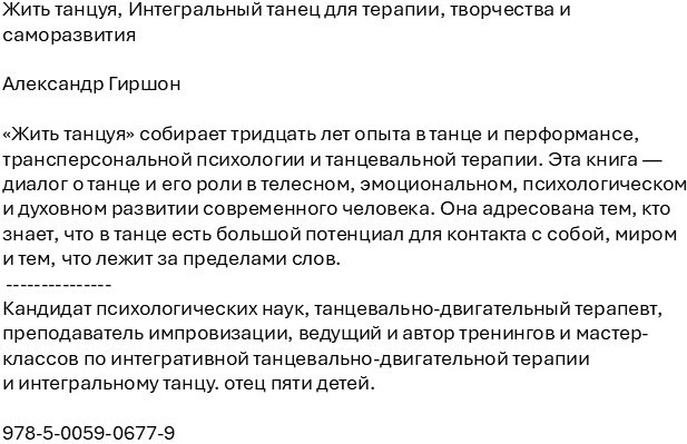 Жить танцуя. Интегральный танец для терапии, творчества и саморазвитияВ данный момент этот товар отсутствует в продаже. Возможно, у нас найдется аналогичный или похожий товар здесь. «Жить танцуя» собирает тридцать лет опыта в танце и перформансе, трансперсональной психологии и танцевальной терапии. Эта книга — диалог о танце и его роли в телесном, эмоциональном, психологическом и духовном развитии современного человека. Она адресована тем, кто знает, что в танце есть большой потенциал для контакта с собой, миром и тем, что лежит за пределами слов. |
