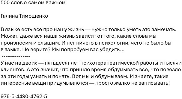 500 слов о самом важномТимошенко Галина Валентиновна, Леоненко Елена Анатольевна В данный момент этот товар отсутствует в продаже. Возможно, у нас найдется аналогичный или похожий товар здесь. В языке есть все про нашу жизнь — нужно только уметь это замечать. Может, даже вся наша жизнь зависит от того, какие слова мы произносим и слышим. И нет ничего в психологии, чего не было бы в языке. Не верите? Мы попробуем вас убедить... |