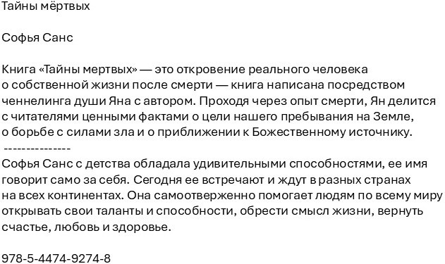 Тайны мёртвыхВ данный момент этот товар отсутствует в продаже. Возможно, у нас найдется аналогичный или похожий товар здесь. Книга «Тайны мертвых» — это откровение реального человека о собственной жизни после смерти — книга написана посредством ченнелинга души Яна с автором. Проходя через опыт смерти, Ян делится с читателями ценными фактами о цели нашего пребывания на Земле, о борьбе с силами зла и о приближении к Божественному источнику. |