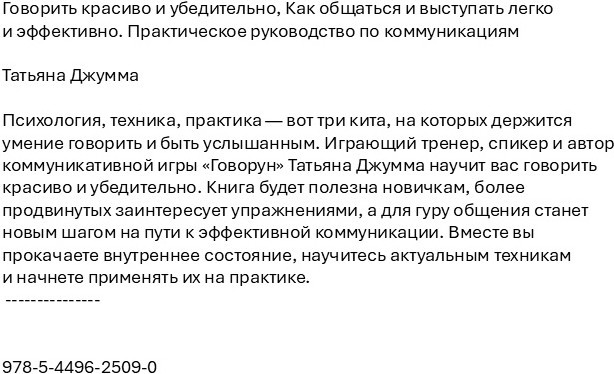 Говорить красиво и убедительно. Как общаться и выступать легко и эффективноВ данный момент этот товар отсутствует в продаже. Возможно, у нас найдется аналогичный или похожий товар здесь. Психология, техника, практика — вот три кита, на которых держится умение говорить и быть услышанным. Играющий тренер, спикер и автор коммуникативной игры «Говорун» Татьяна Джумма научит вас говорить красиво и убедительно. Книга будет полезна новичкам, более продвинутых заинтересует упражнениями, а для гуру общения станет новым шагом на пути к эффективной коммуникации. Вместе вы прокачаете внутреннее состояние, научитесь актуальным техникам и начнете применять их на практике.  |