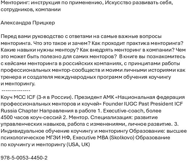 Менторинг. Искусство развивать себя, сотрудников, компанииВ данный момент этот товар отсутствует в продаже. Возможно, у нас найдется аналогичный или похожий товар здесь. Перед вами руководство с ответами на самые важные вопросы менторинга. Что это такое и зачем? Как проходит практика менторинга? Какие навыки нужны ментору? Как внедрять менторинг в компании? Чем это может быть полезно для самих менторов? В книге вы познакомитесь с кейсами менторинга в российских компаниях, с принципами работы профессиональных ментор-сообществ и моими личными историями как тренера и создателя международных программ обучения коучингу и менторингу. |
